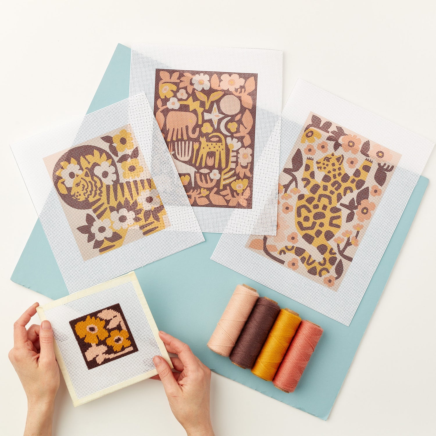 Learn to needlepoint with Leah's new beginner folk floral kit with Zollie. Or continue your learning with her new Wild Cat Needlepoint pattern collection!
