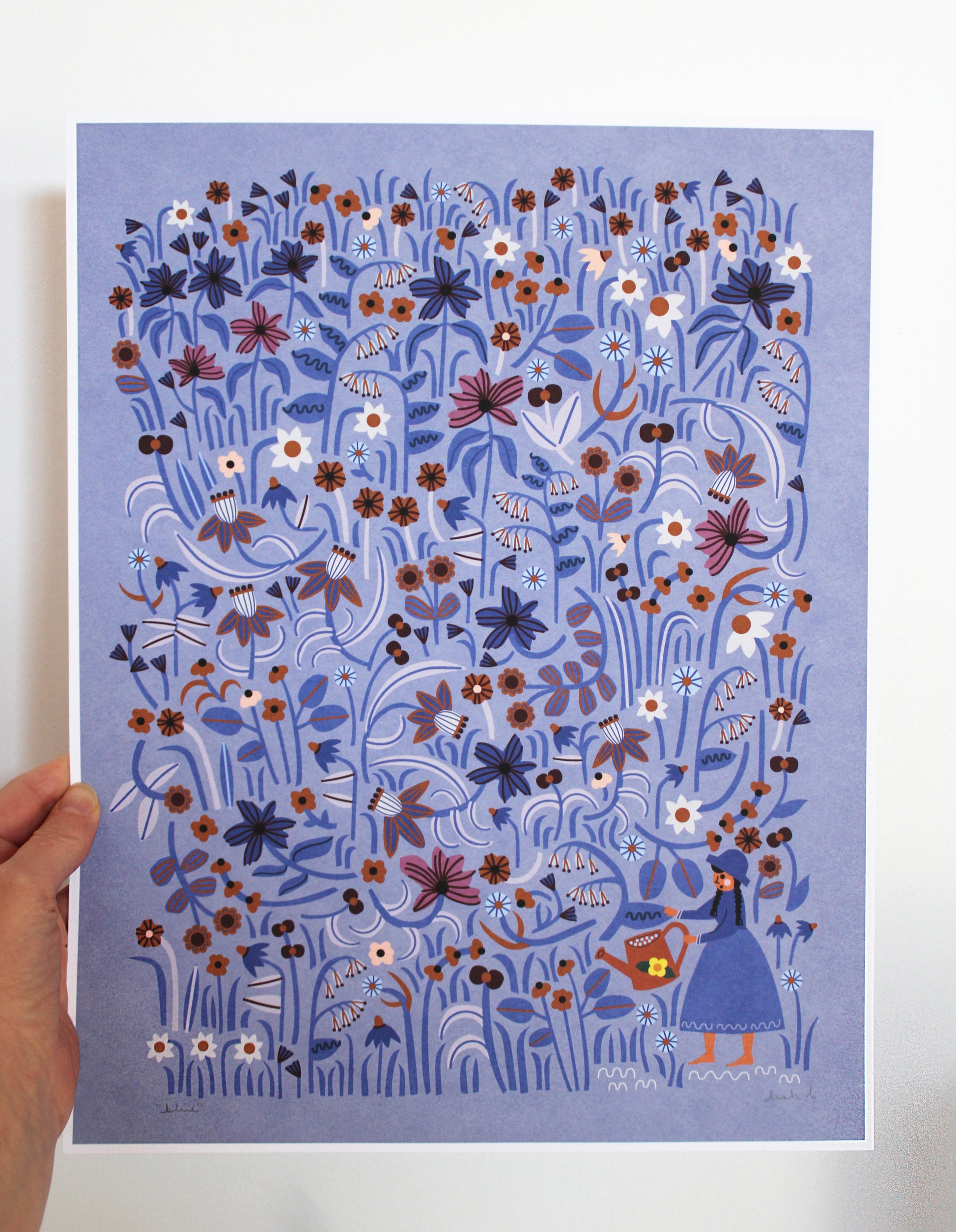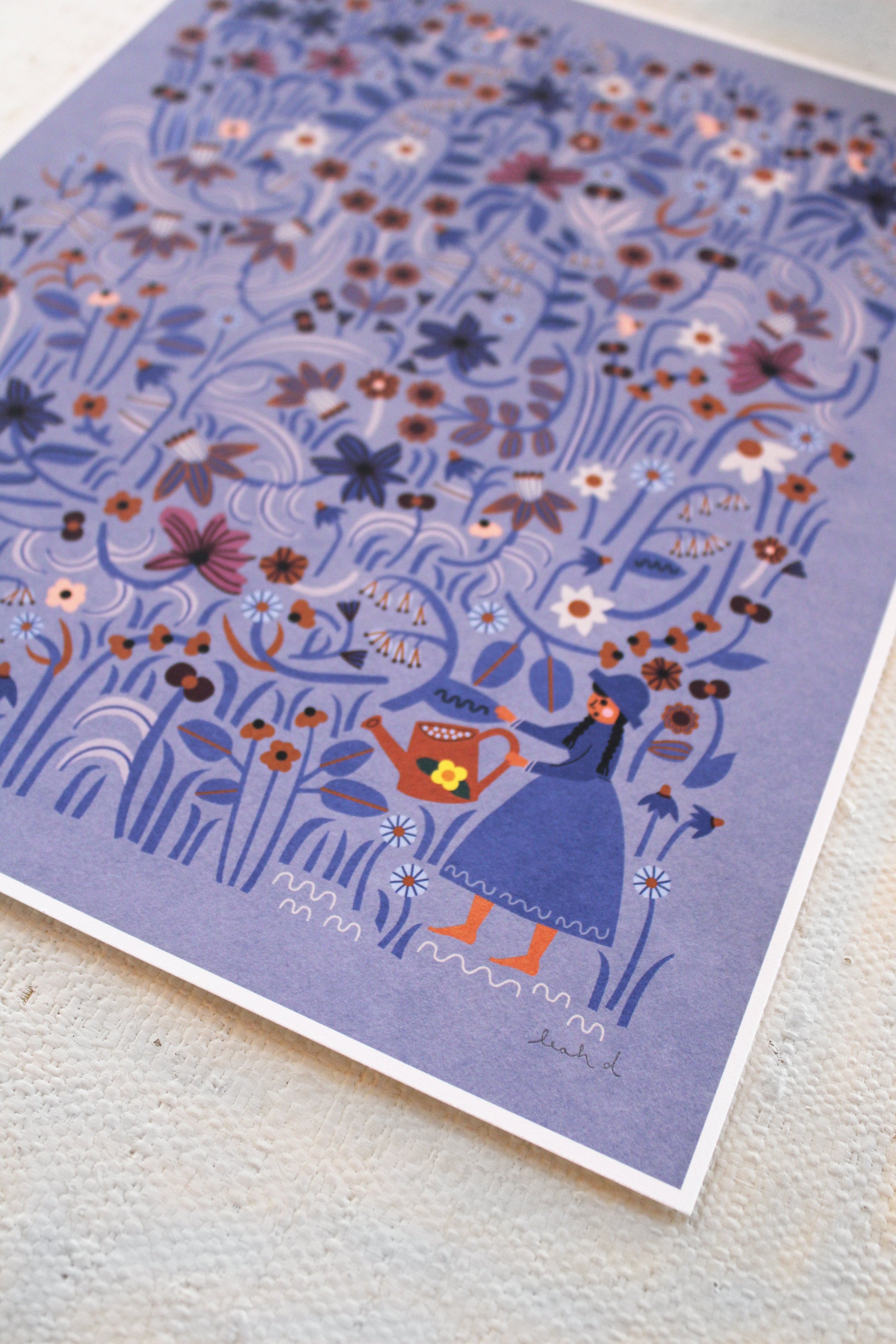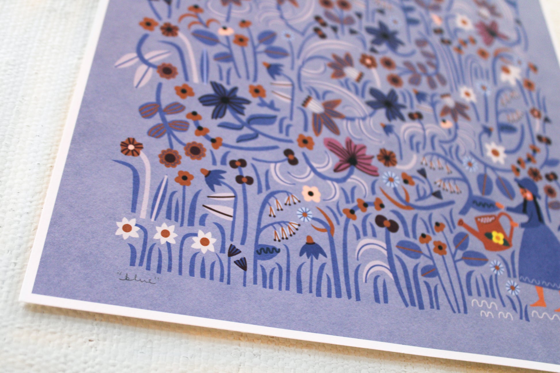 This is an archival print of Leah's "Blue" illustration in tones of periwinkle, blue, orange, copper, burgundy, orchid, yellow, peach, and black on a medium periwinkle blue background. This illustration features a young girl watering her garden with a modern folk inspired floral illustration that feels modern and classic at the same time.