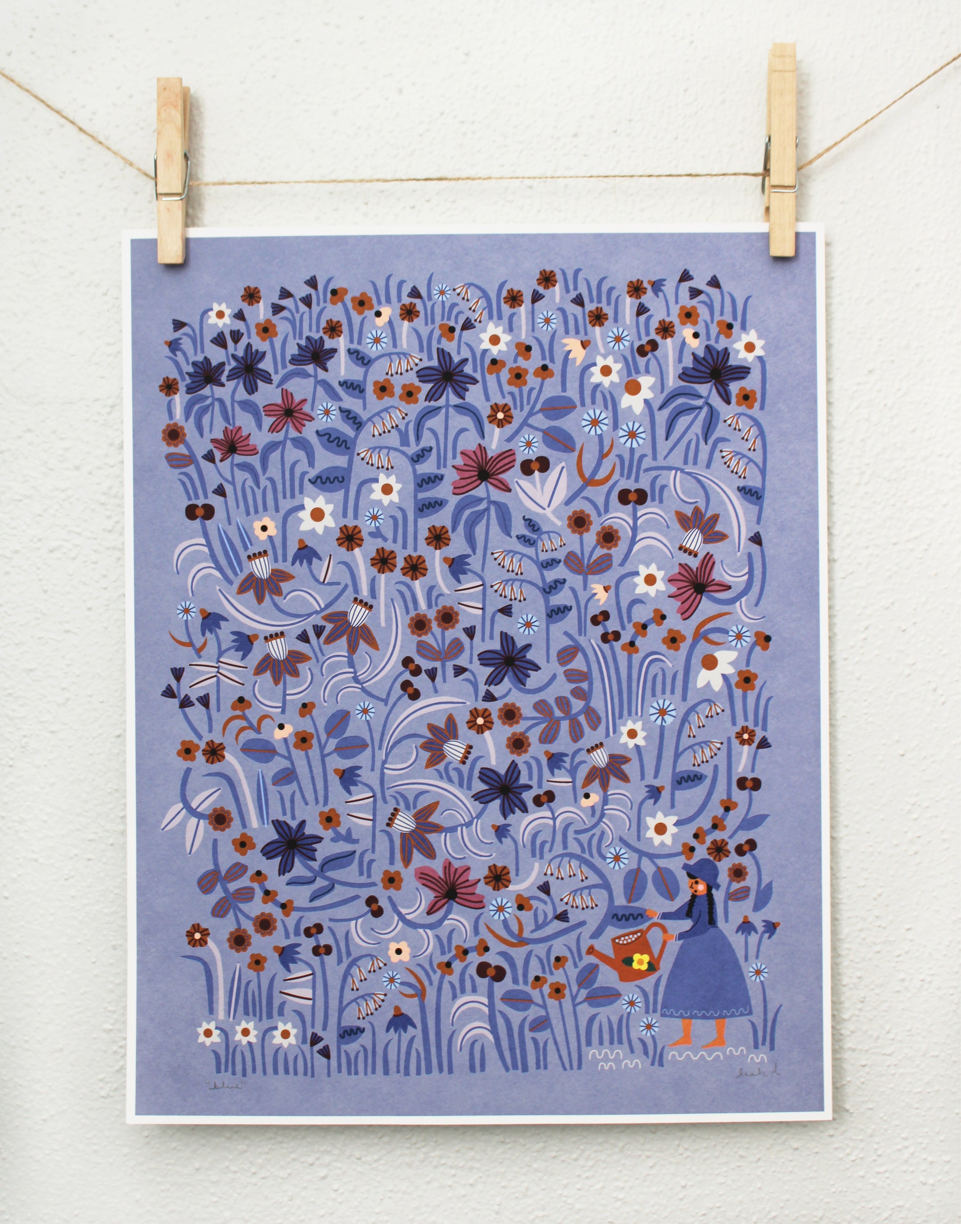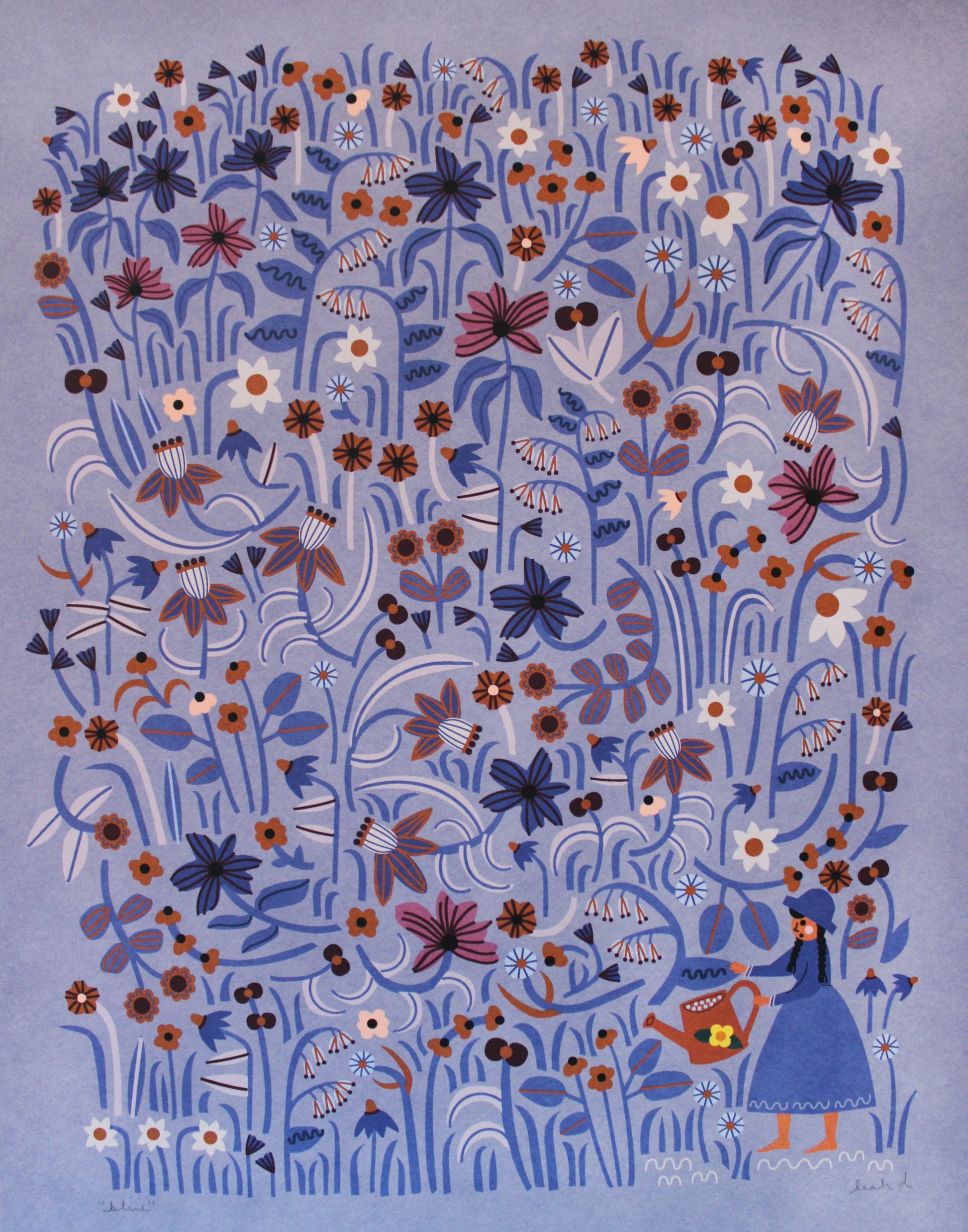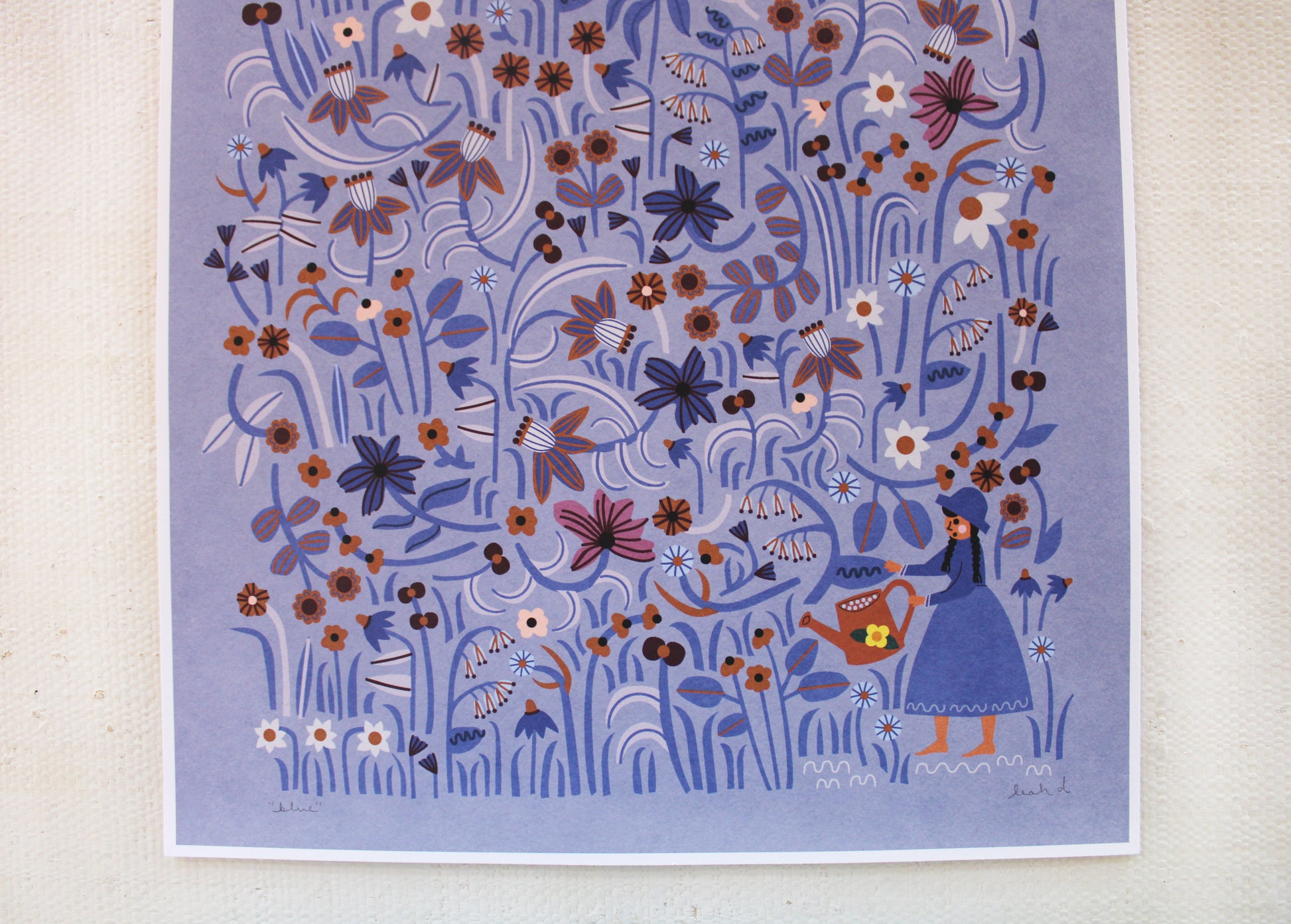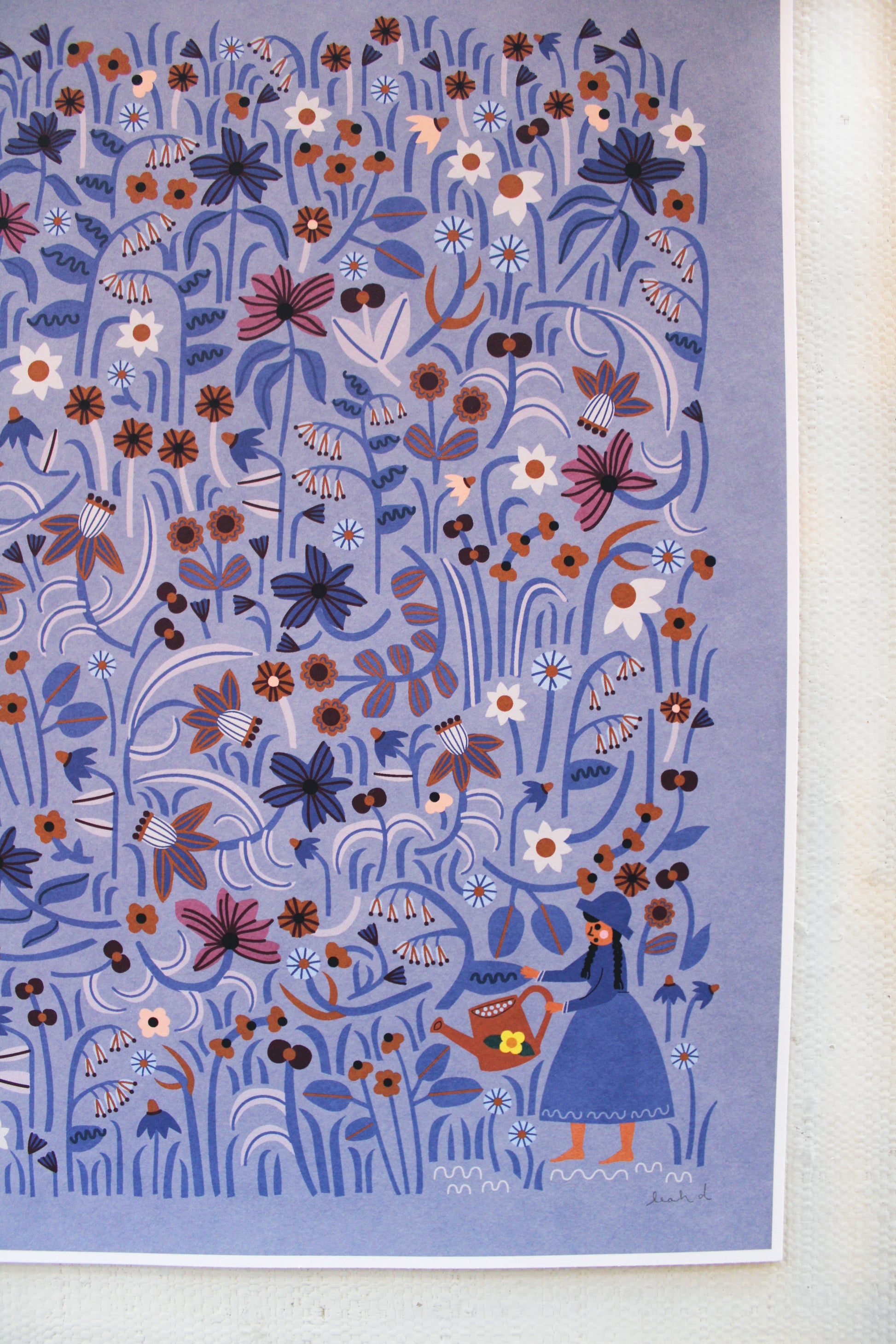 This is an archival print of Leah's "Blue" illustration in tones of periwinkle, blue, orange, copper, burgundy, orchid, yellow, peach, and black on a medium periwinkle blue background. This illustration features a young girl watering her garden with a modern folk inspired floral illustration that feels modern and classic at the same time.