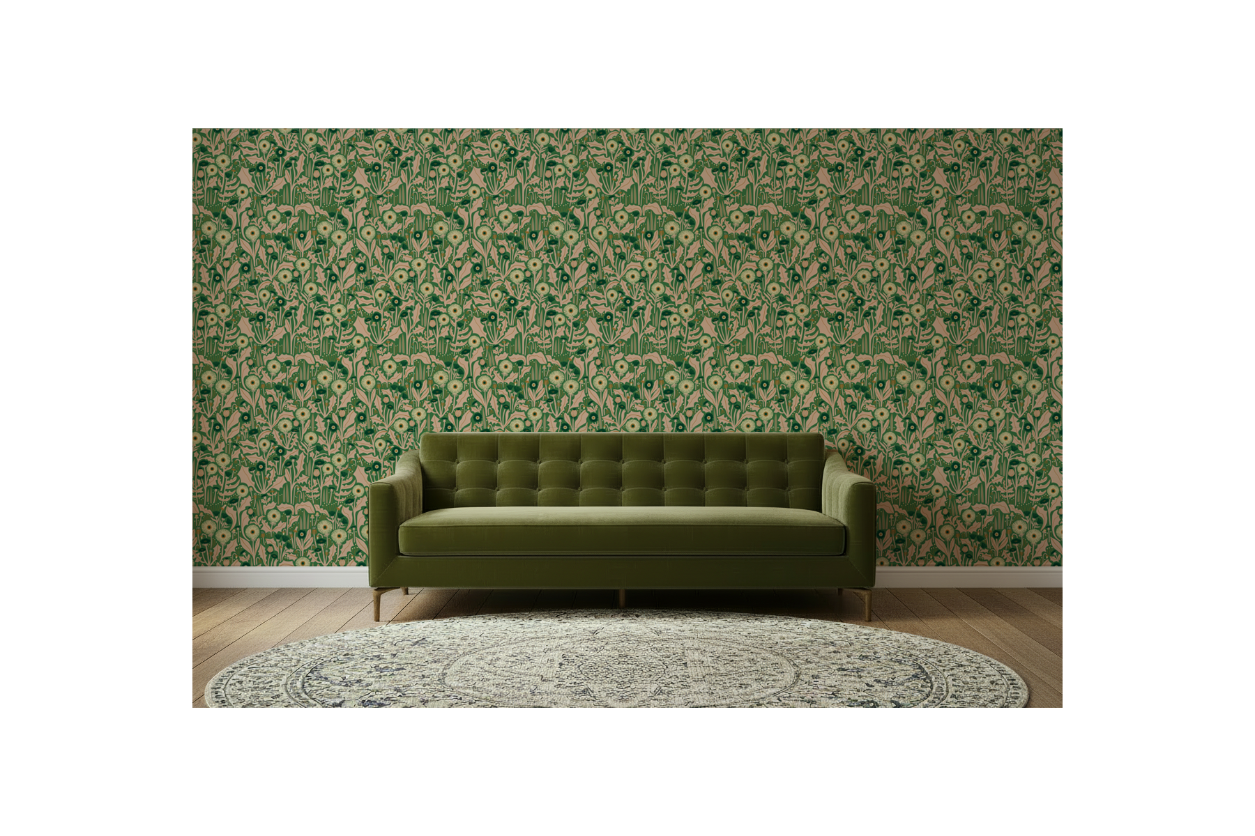 This wallpaper features Leah's dandelion pattern in tones of blush, ochre, off-white, and dark green on a green background.