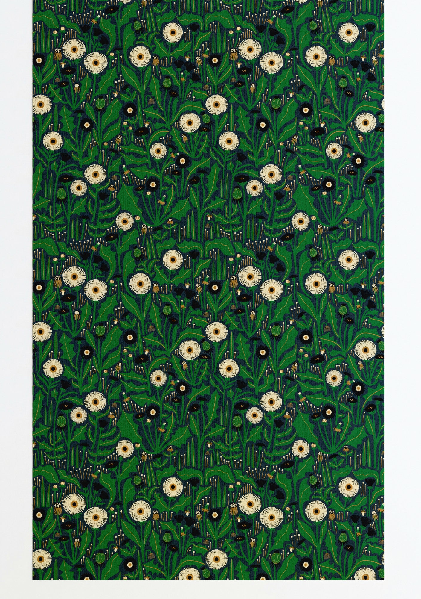 This wallpaper features Leah's dandelion pattern in tones of green, off-white, ochre, and black on a navy background.