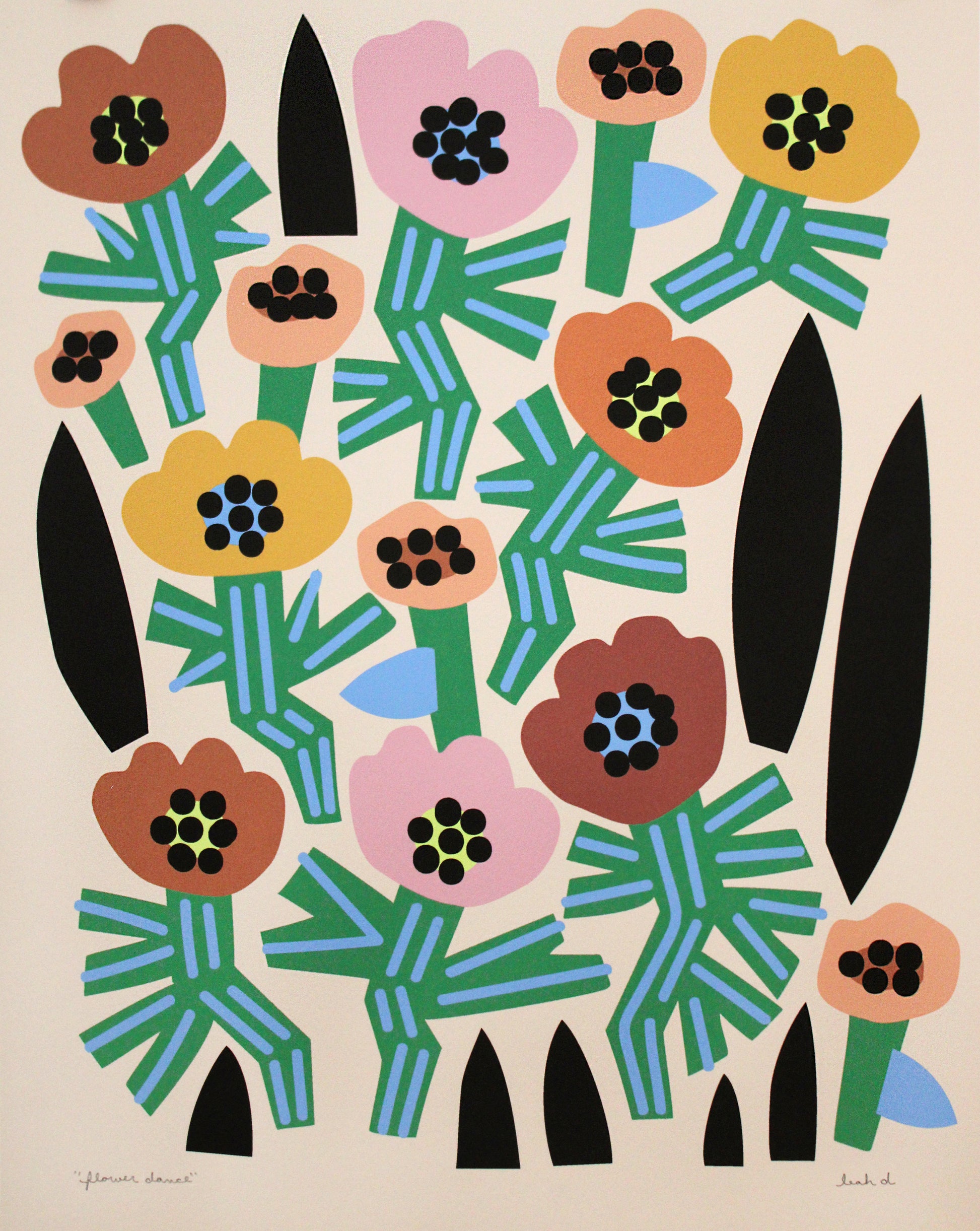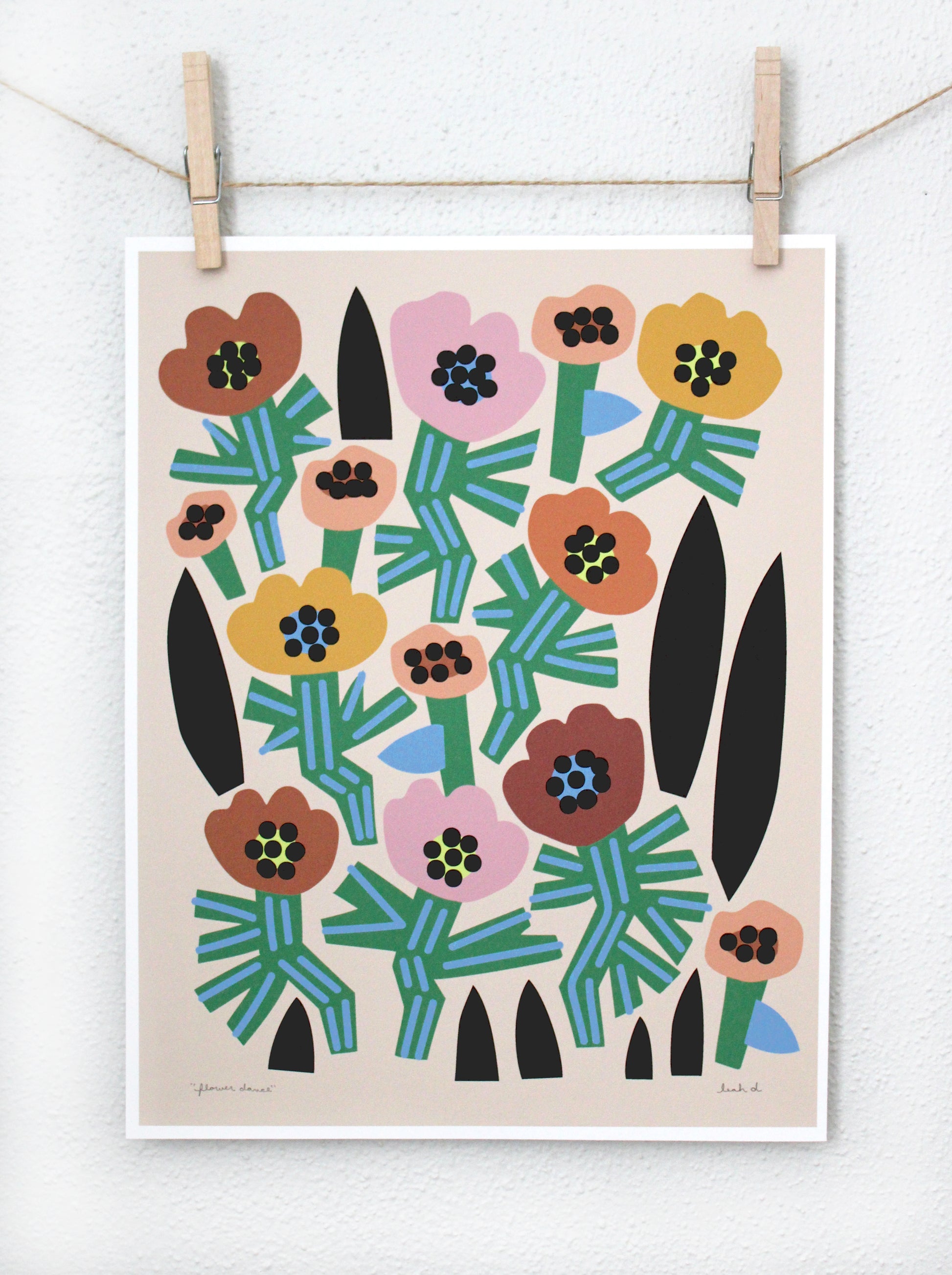 This is an archival print of Leah's "Flower Dance" drawing in black, green, golden yellow, yellow, pink, light blue, and peach on a light tan background. These flowers are having a party.
