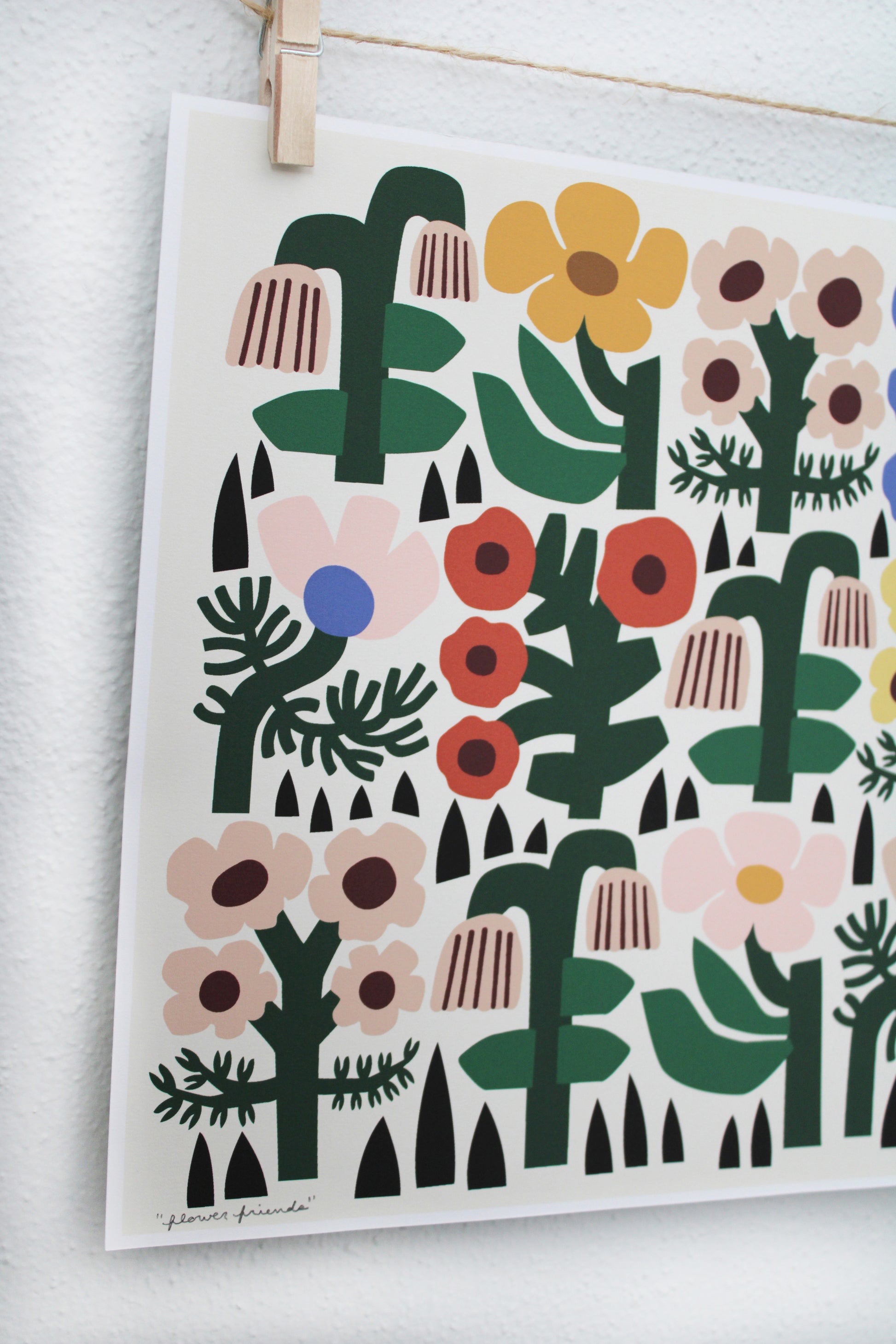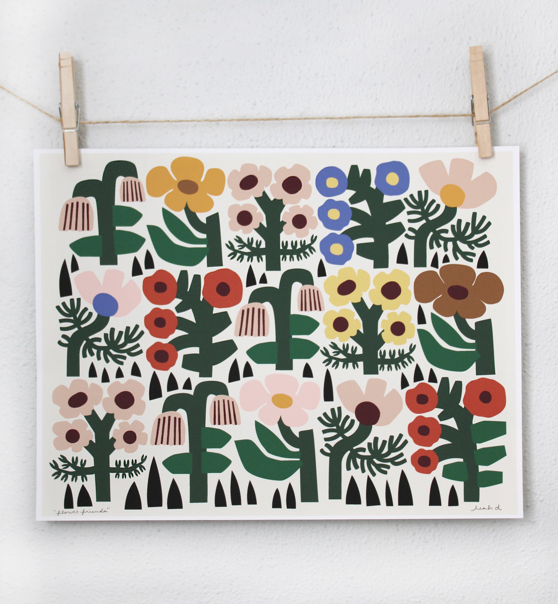 This is an archival print of Leah's "flower friends" in tones of pink, beige, yellow, brown, green, and blue on an off-white background.