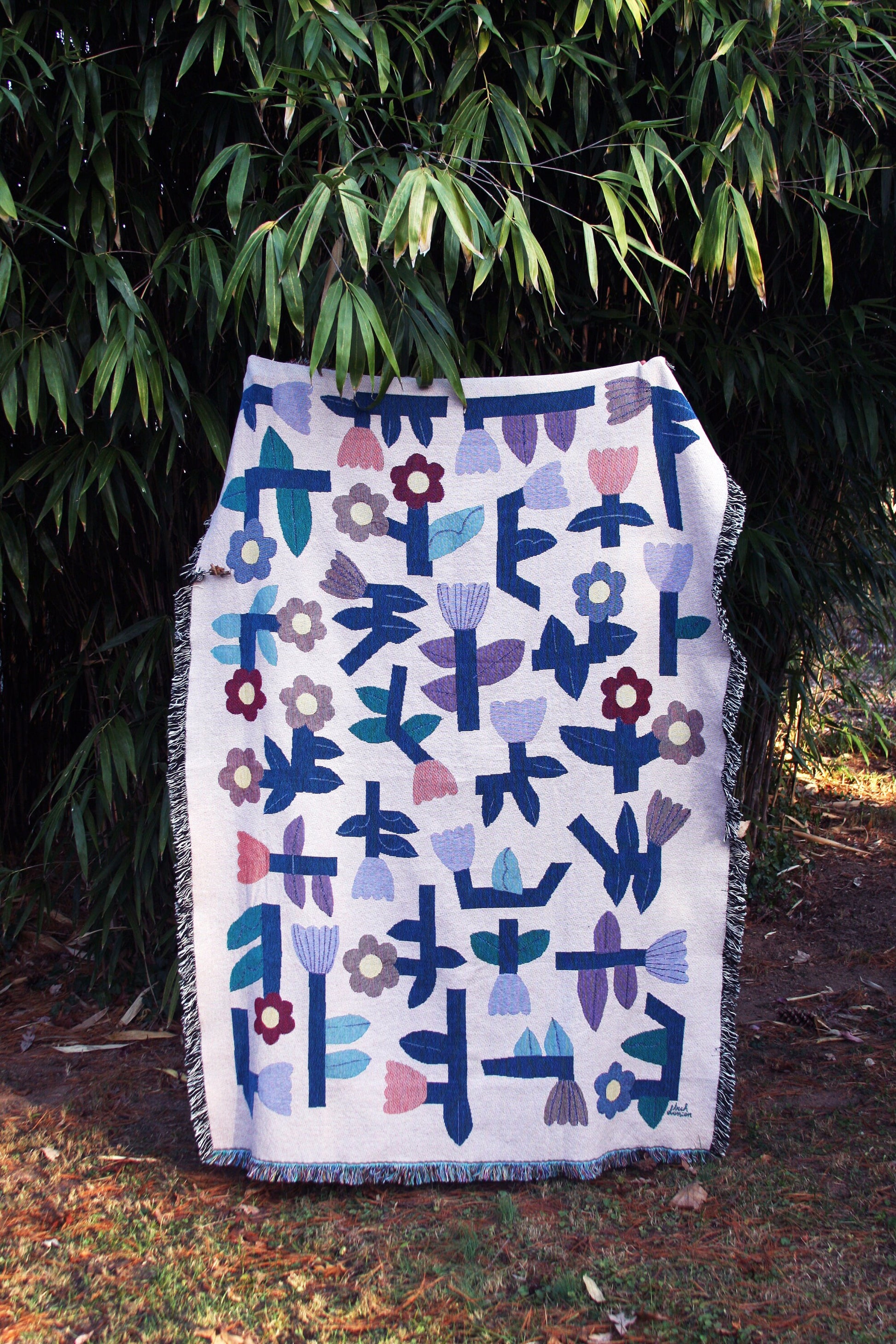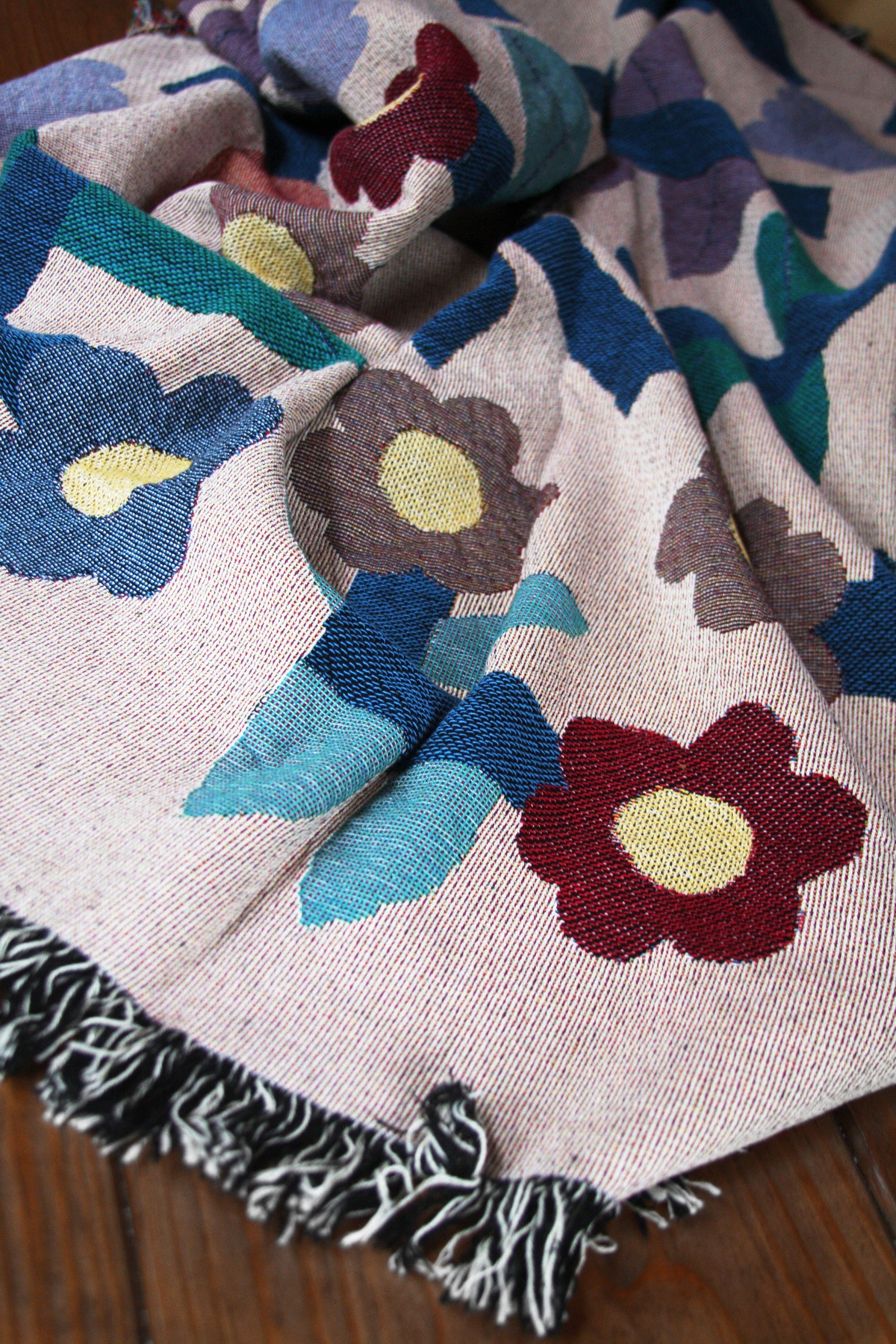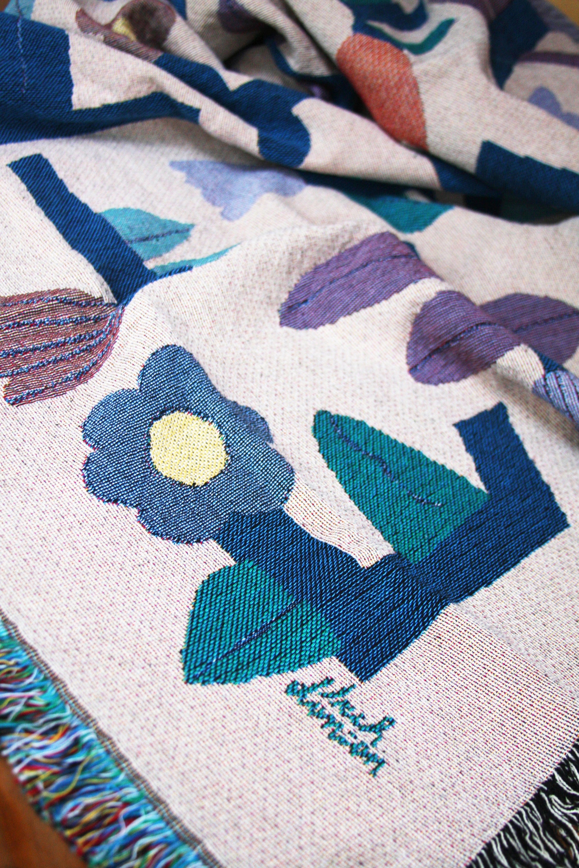 This is a woven throw blanket featuring Leah's "flower tetris" design. This blanket is a large 54" x 72" tapestry. It is 100% cotton with most of the cotton being recycled. Featuring flowers in blue, yellow, green, coral, burgundy, lavender, and brown on a beige background. This can be used as a throw blanket or hung up as a tapestry.