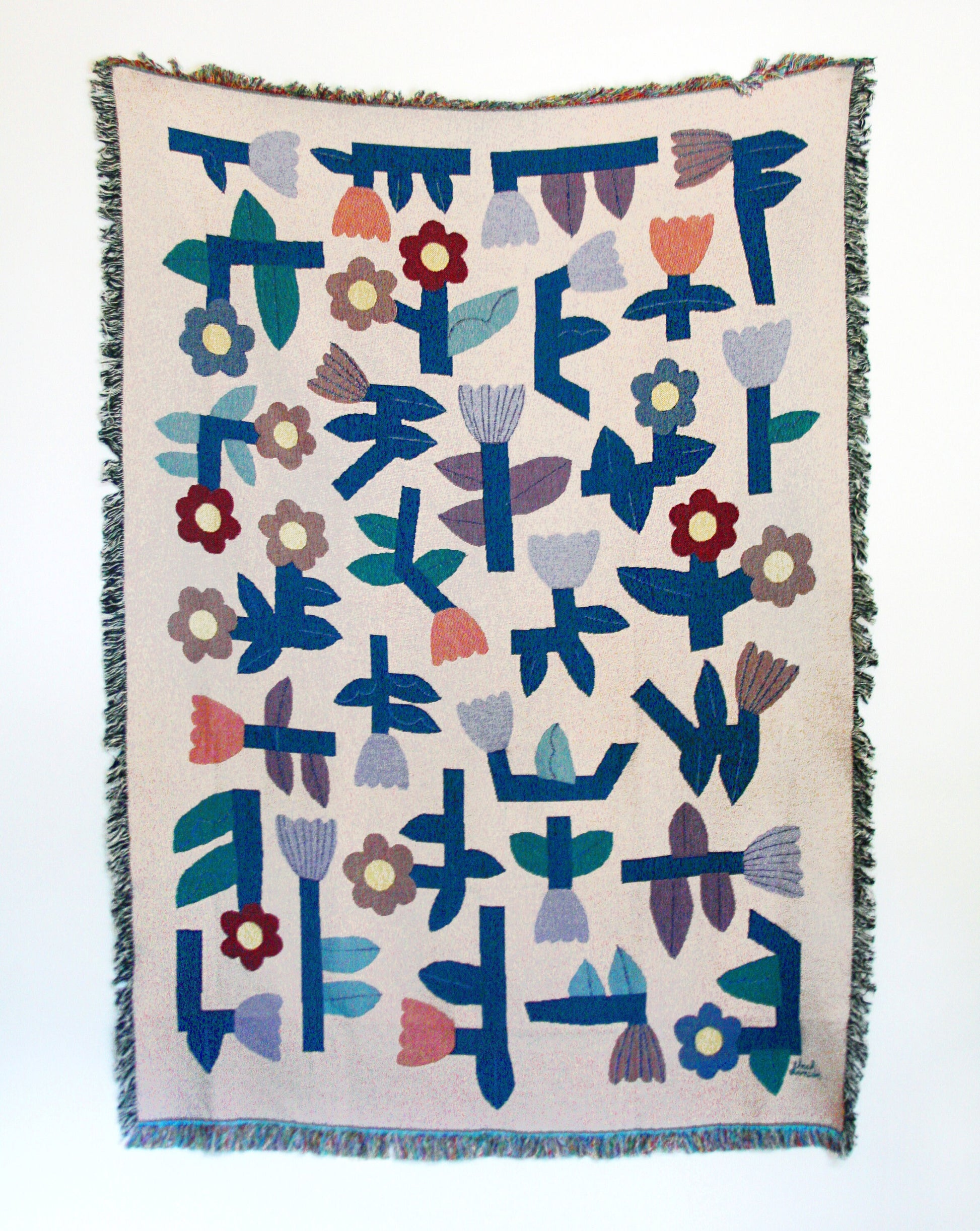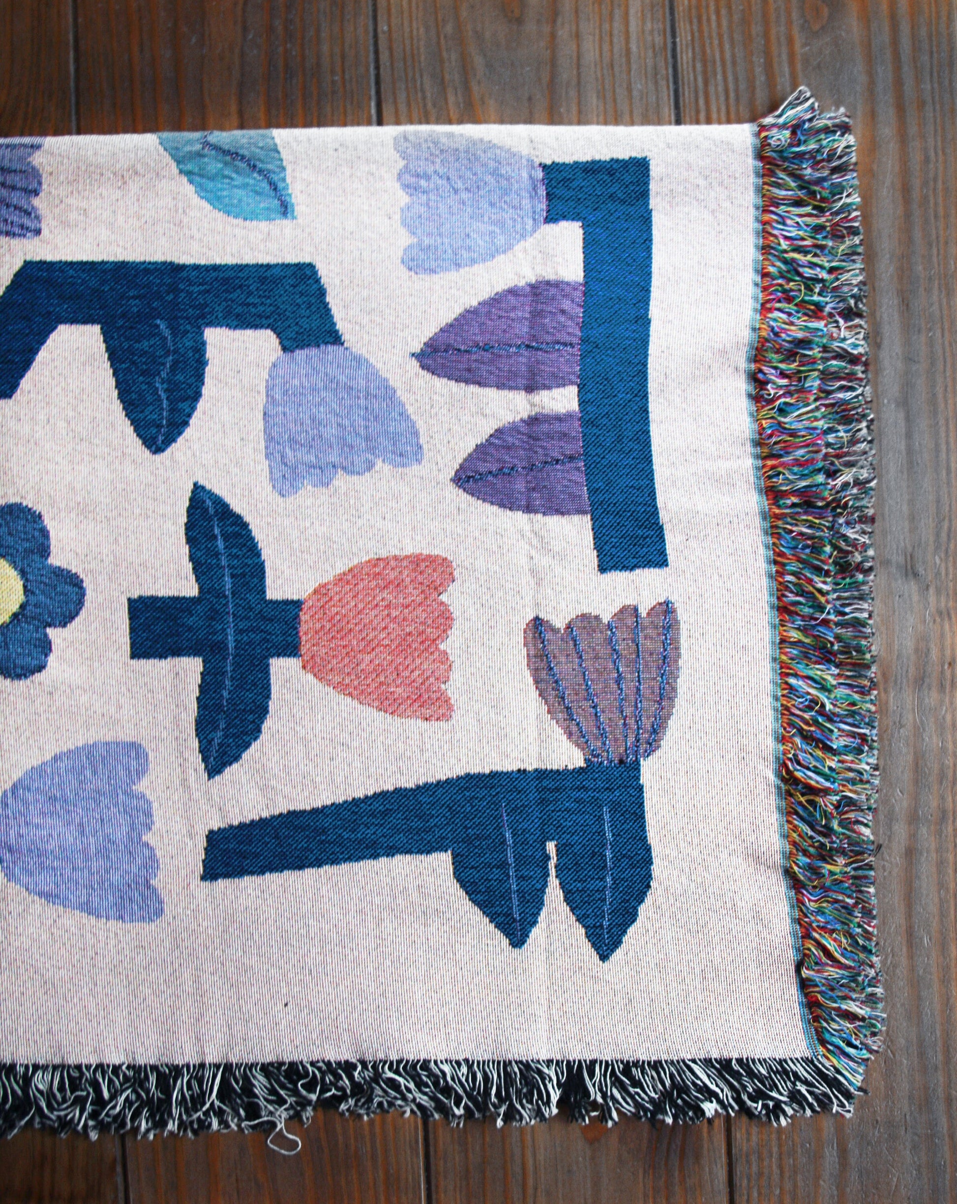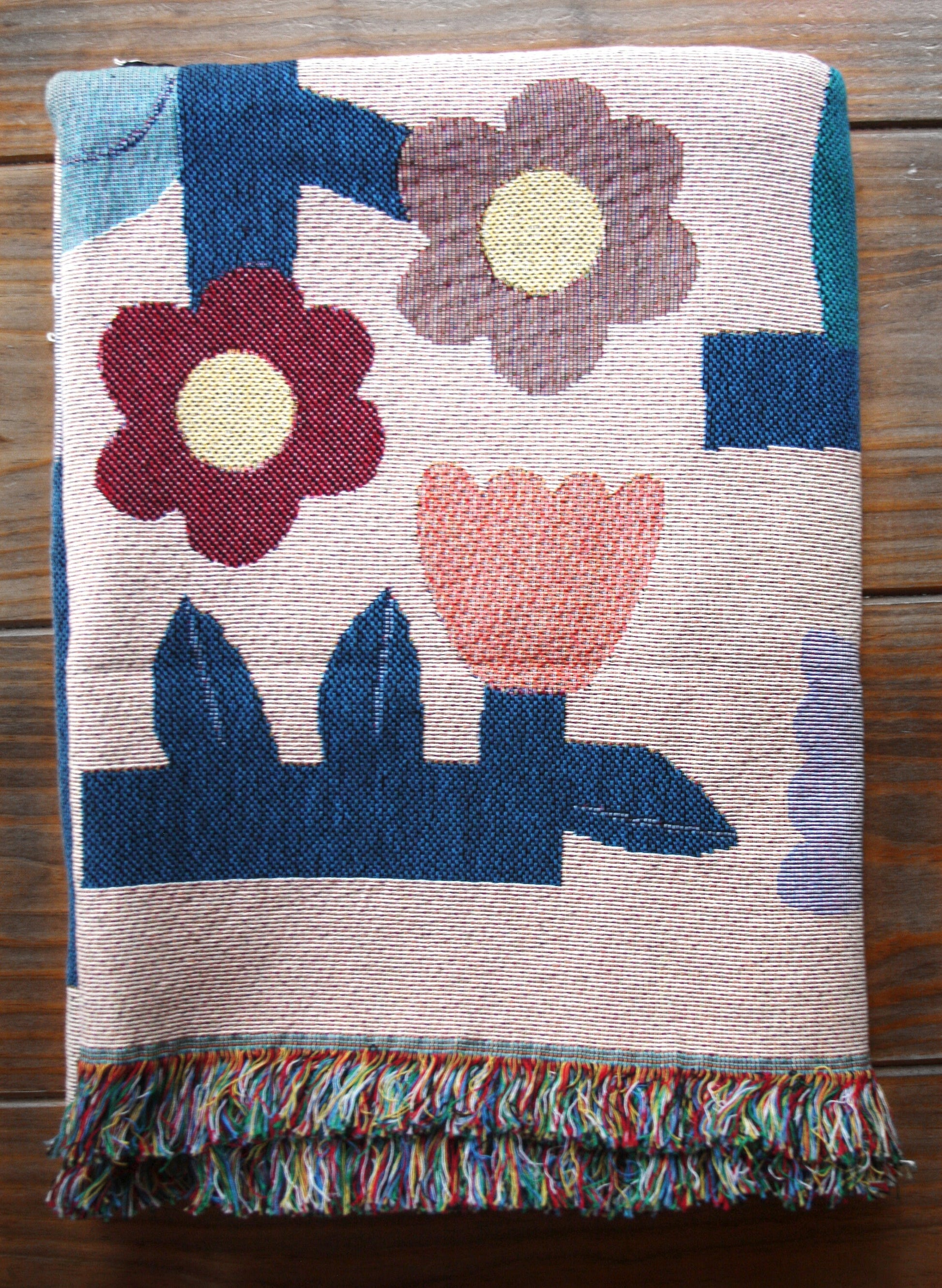 This is a woven throw blanket featuring Leah's "flower tetris" design. This blanket is a large 54" x 72" tapestry. It is 100% cotton with most of the cotton being recycled. Featuring flowers in blue, yellow, green, coral, burgundy, lavender, and brown on a beige background. This can be used as a throw blanket or hung up as a tapestry.