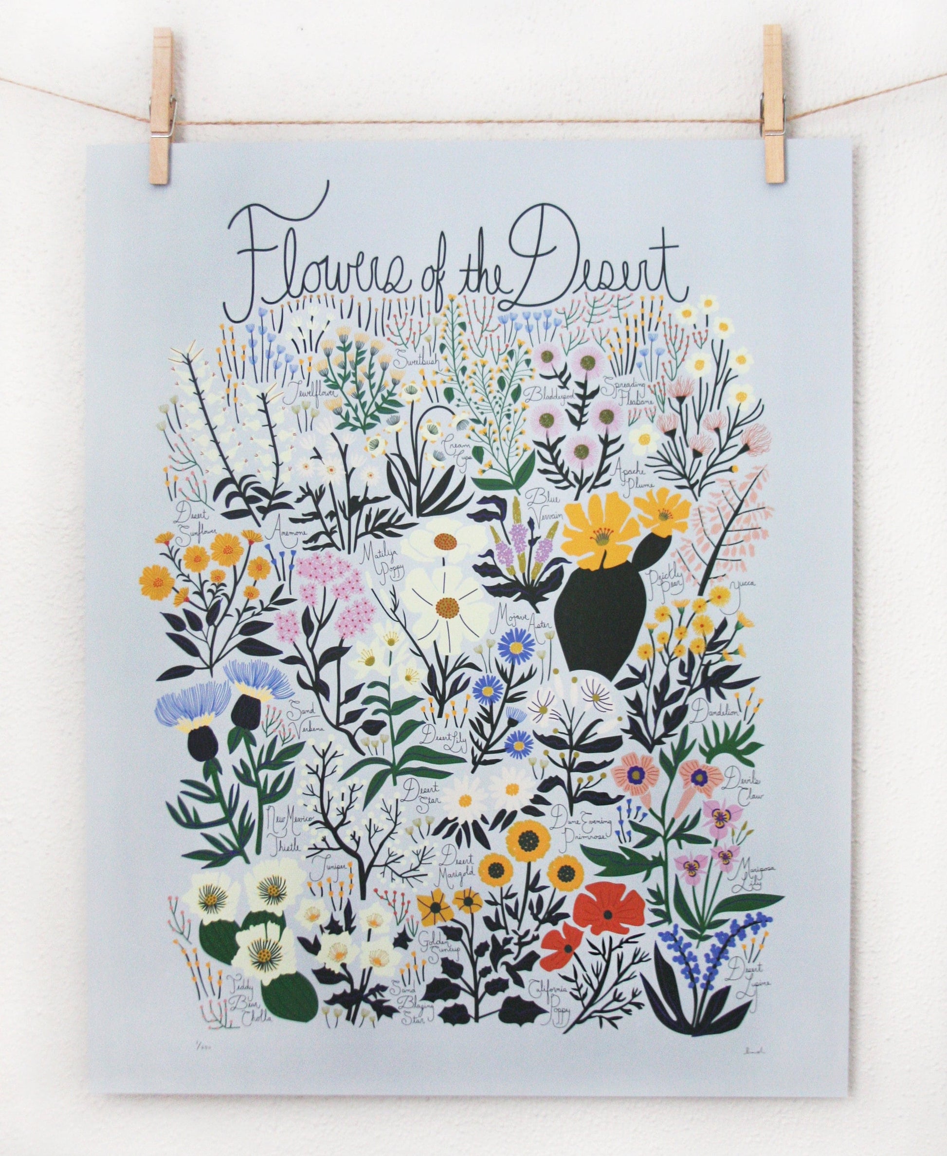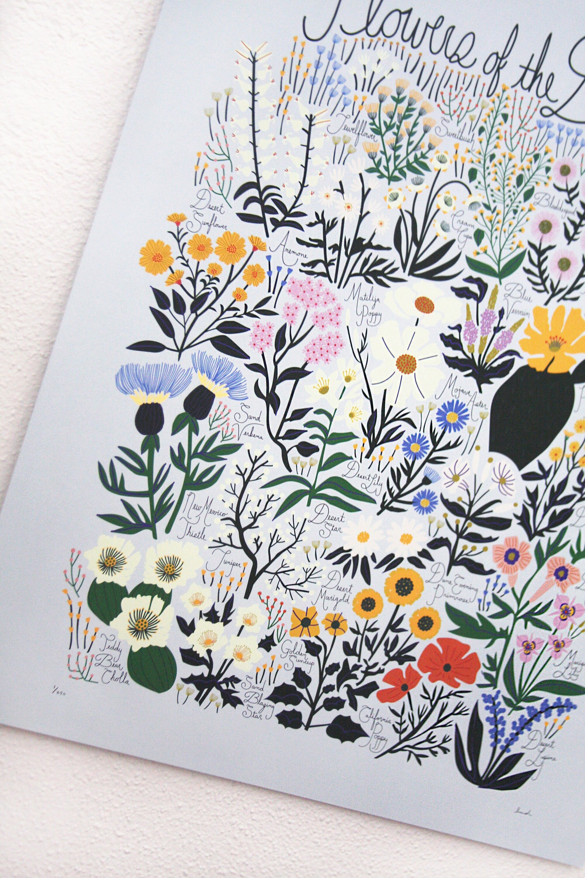 - Flowers featured: Jewelflower, Sweetbush, Bladderpod, Spreading Fleabane, Apache Plume, Blue Vervain, Cream Cups, Matilija Poppy, Anemone, Desert Sunflower, Mojave Aster, Prickly pear, Yucca, Dandelion, Devil's Claw, Desert lily, Sand verbena, New Mexico Thistle, Desert Marigold, Dune Evening Primrose, Desert Star, Mariposa Lily, Desert Lupine, California Poppy, Golden Suncup, Sand blazing star, Teddy bear cholla, and Juniper.