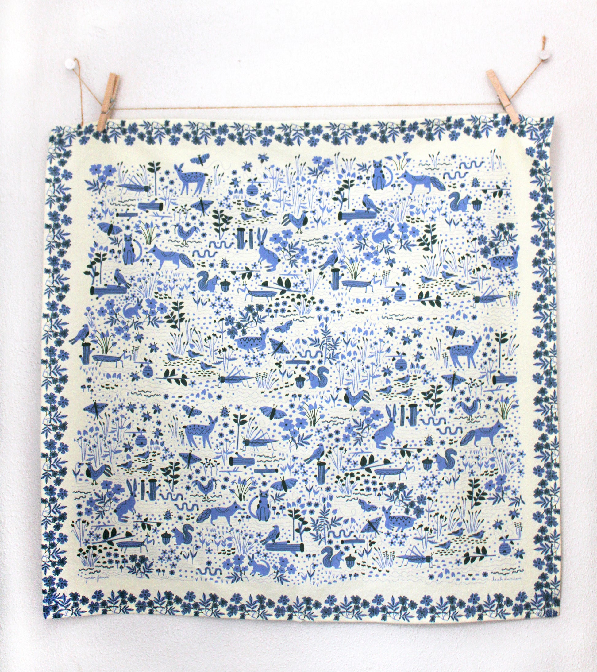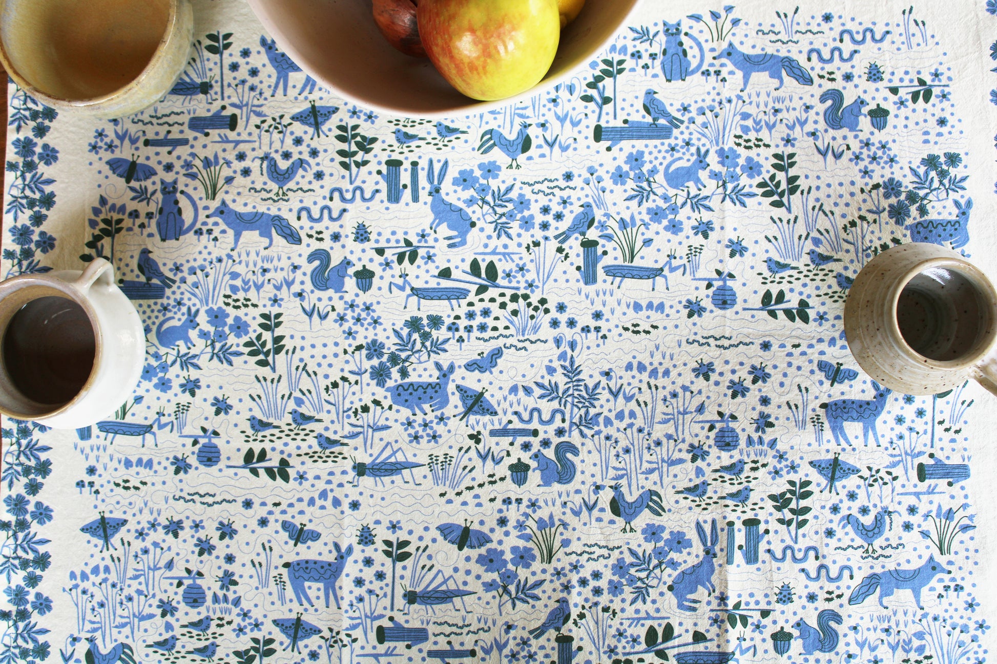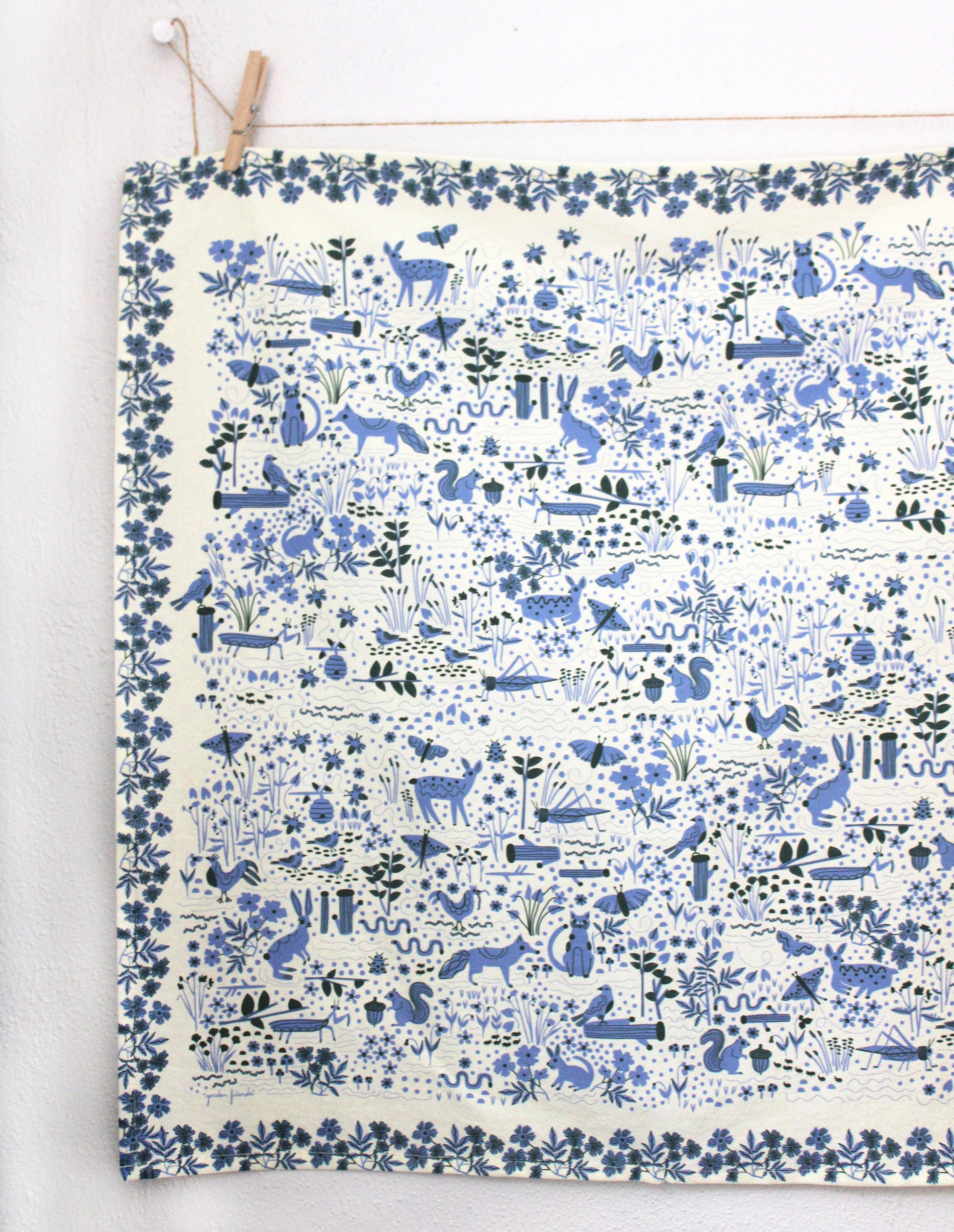 This is a flour sack tea towel featuring Leah's "Garden Friends" design with flowers, bugs, and lots of animal creatures. It features colors of periwinkle blue and dark hunter green on a creamy off white background. Pretty enough to hang on your wall or display in your kitchen.