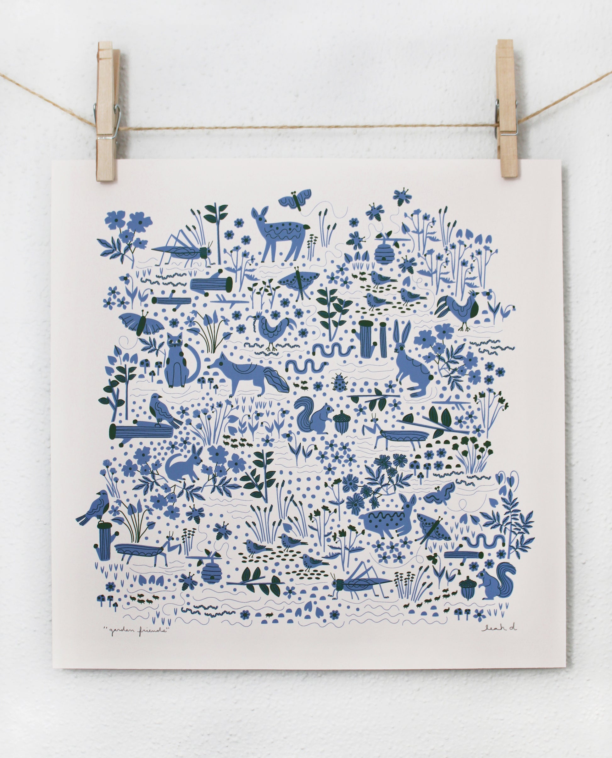This is an archival print of Leah's "Garden Friends" in tones of cornflower blue and hunter green on an off-white background.