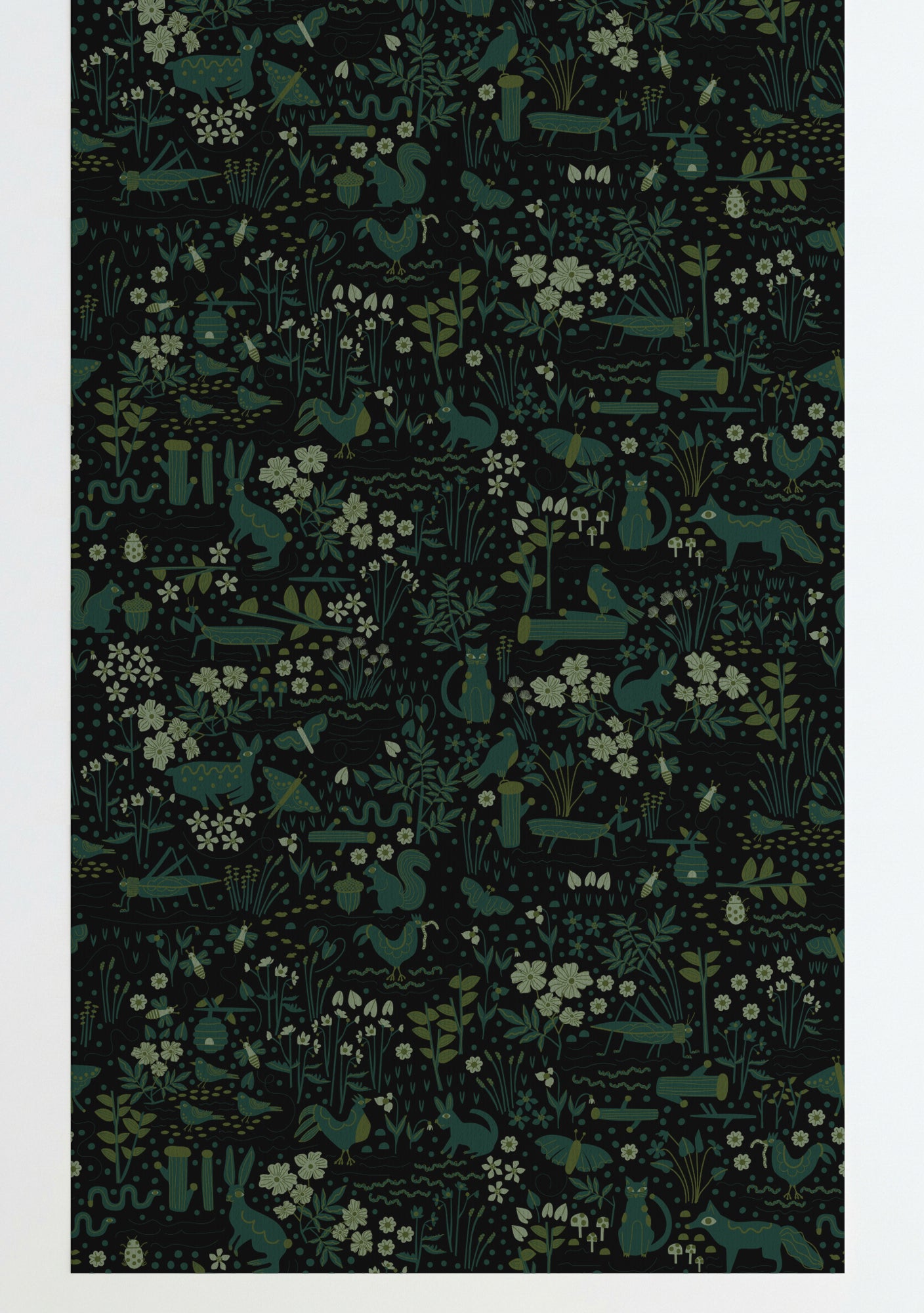 This wallpaper features Leah's garden friends pattern in tones of green on a black background.
