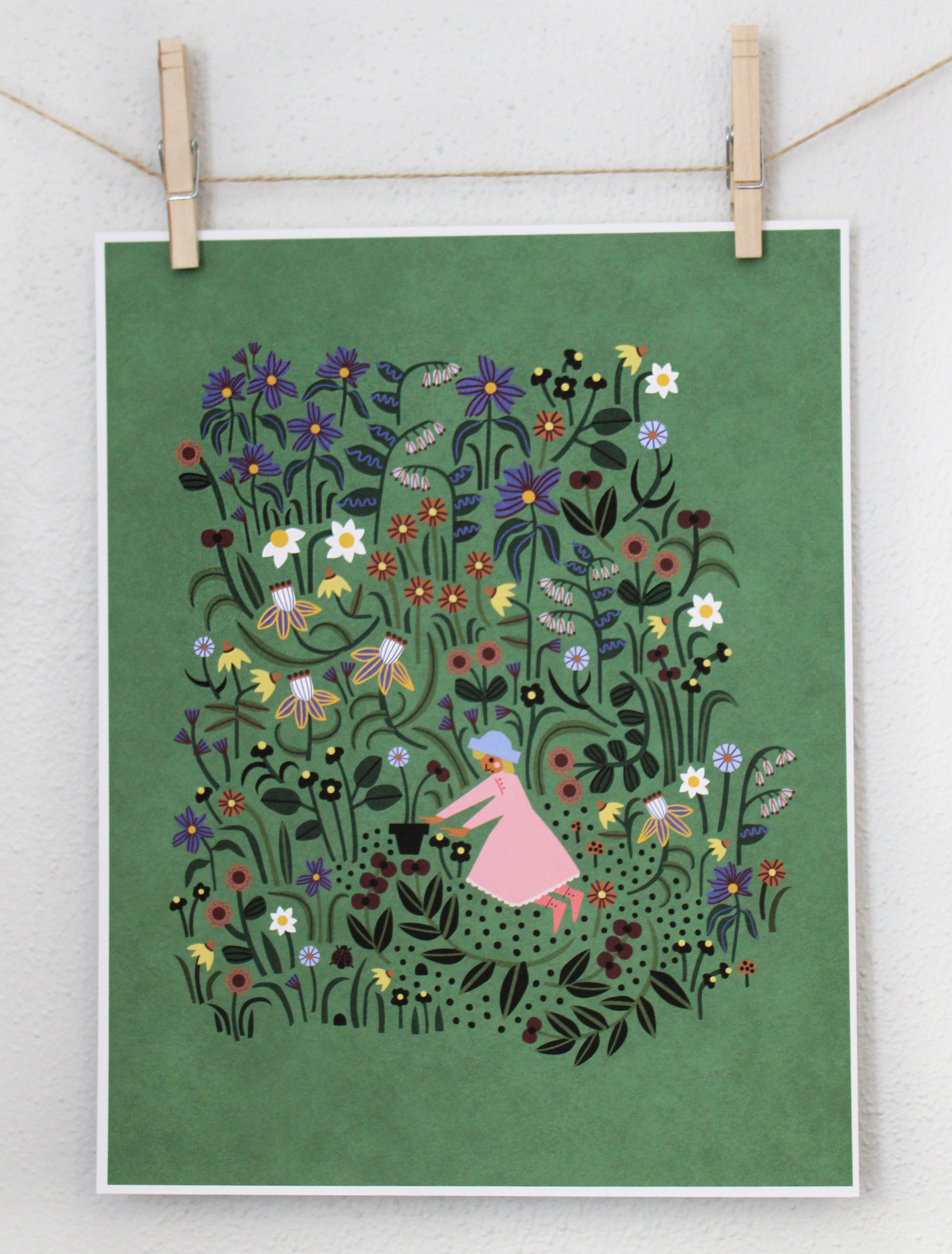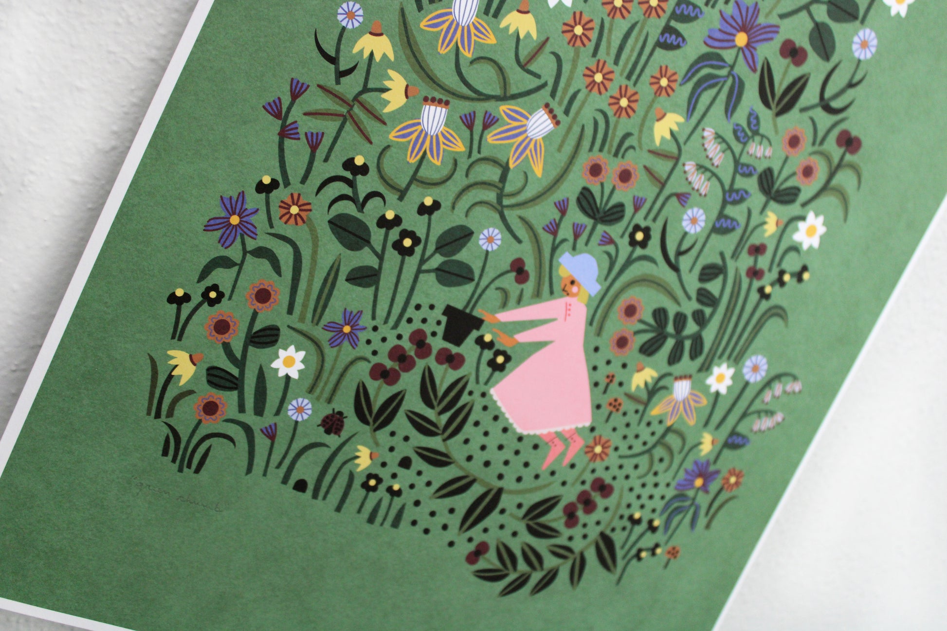 This is an archival print of Leah's "Green Thumb" illustration in tones of pink, blue, yellow, purple, maroon, black, white, orange, light brown on a green background.