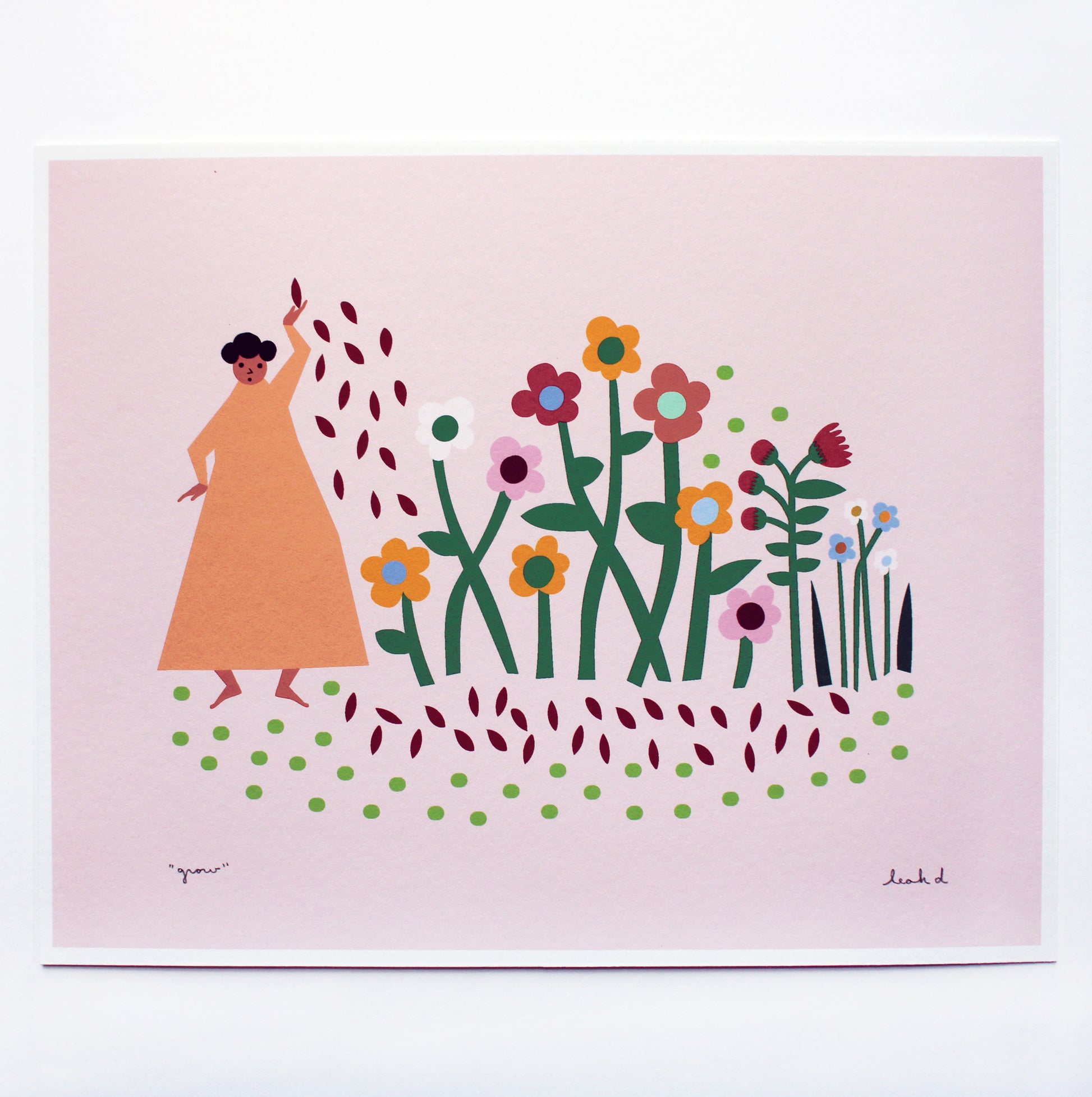 This is an archival print of Leah's "Grow" illustration as a part of her Mother Nature series. It is printed with pigment ink on 110lb acid free paper. Each print is titled and signed at the bottom. Available in sizes 5" x 7", 8" x 10", 11" x 14", and 16" x 20". The colors are periwinkle blue, peach, lavender, brown, green, orange, pink, and yellow on a blush background.