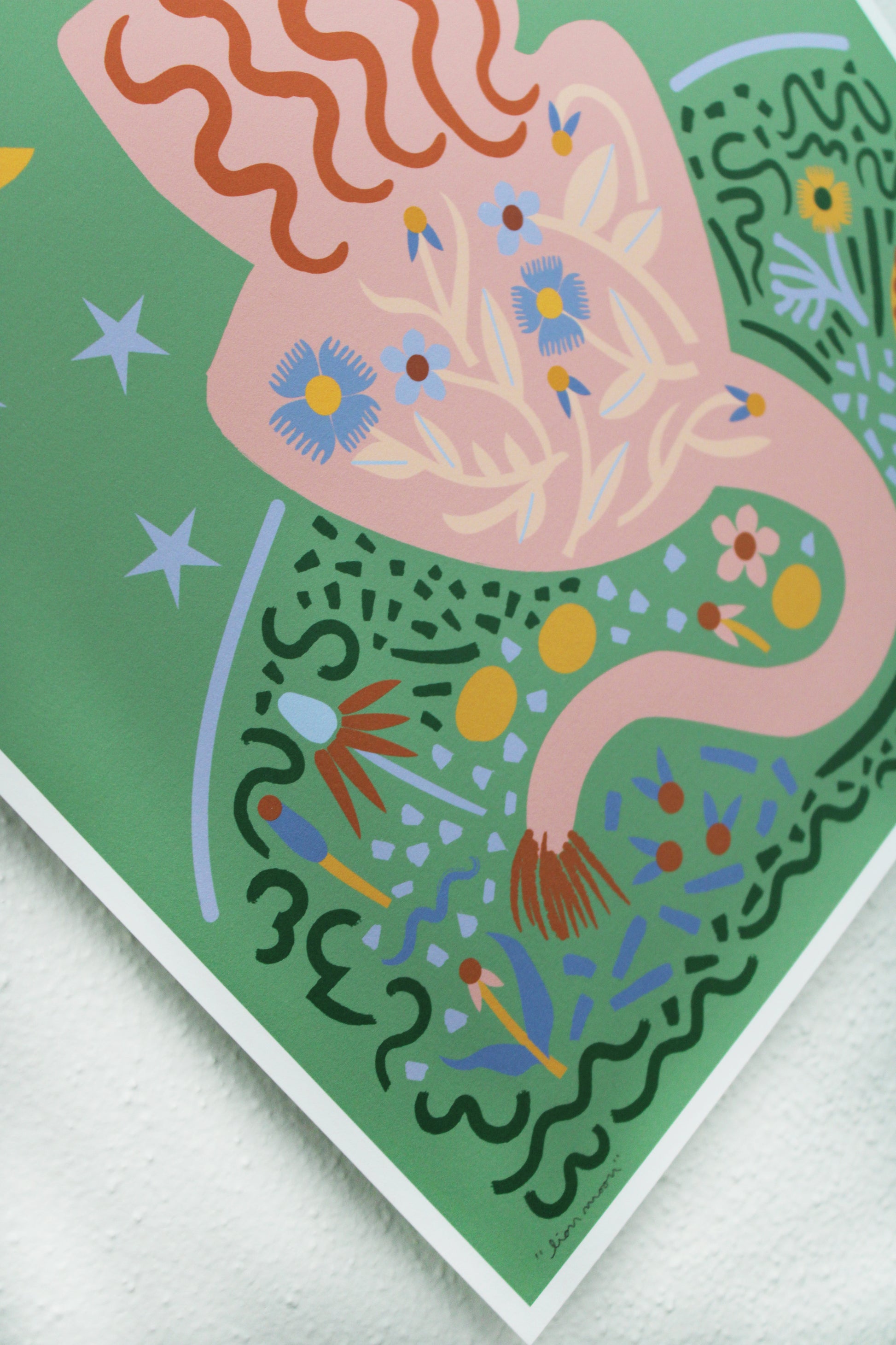 This is an archival print of Leah's "Lion Moon" in tones of pink, coral, golden yellow, blue, and dark green on an avocado background.