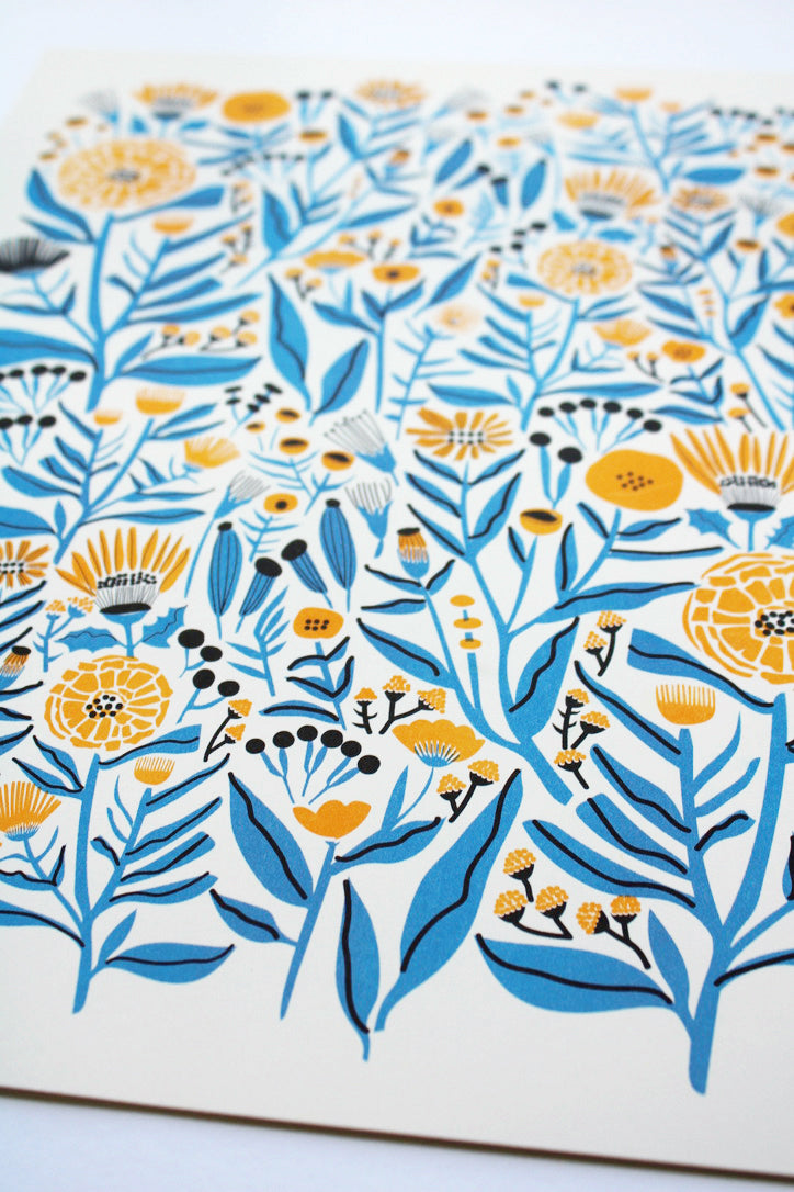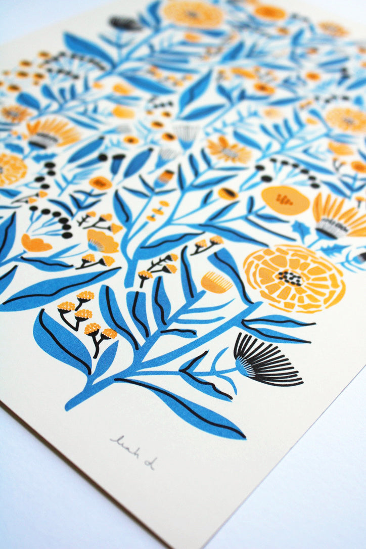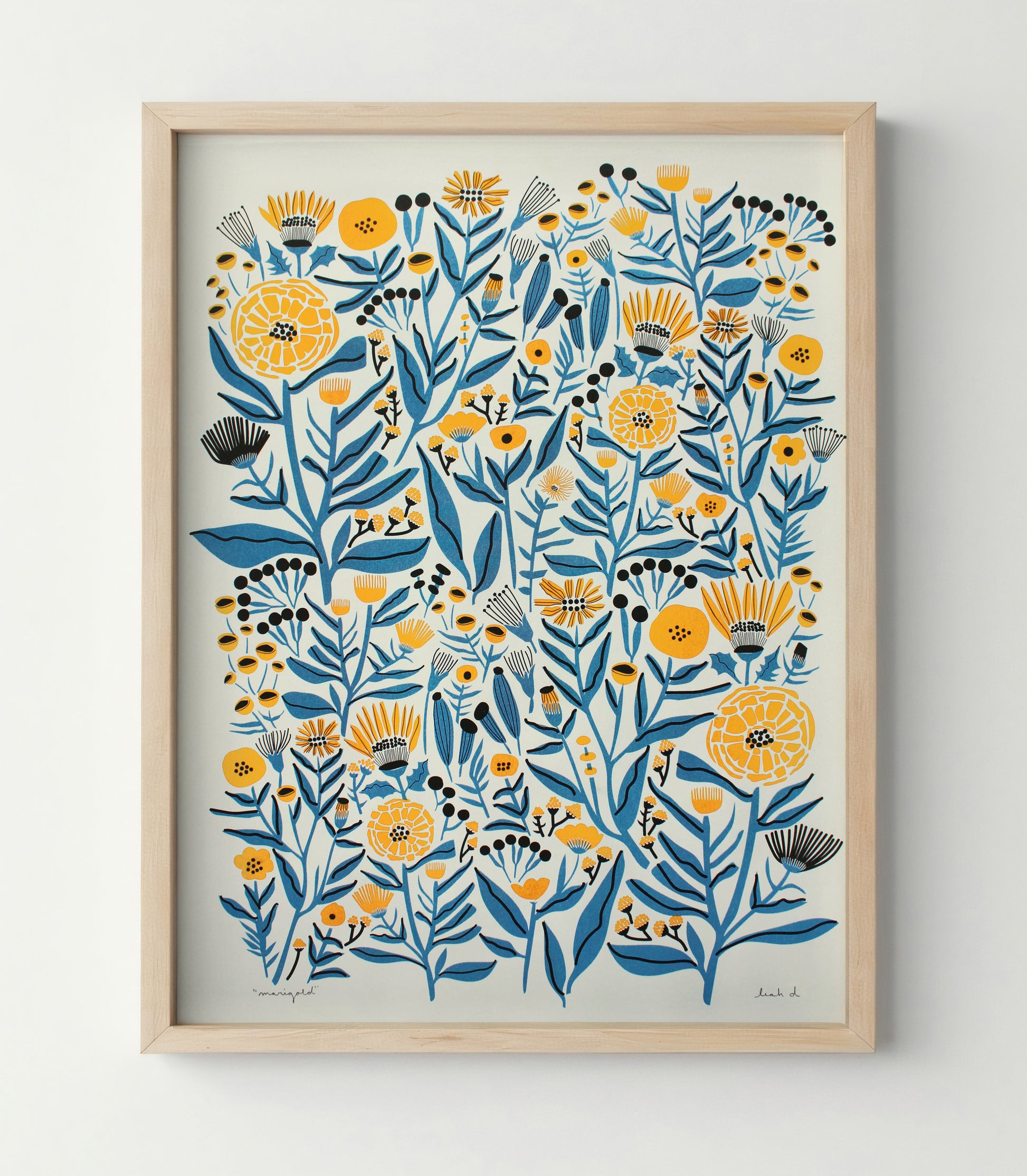 This is a risograph print of Leah's "Marigold" drawing in blue, black, and golden yellow. Printed in Asheville, North Carolina by Woolly Press. It is printed on a creamy off-white 100 lb paper. Print is 11" x 14".