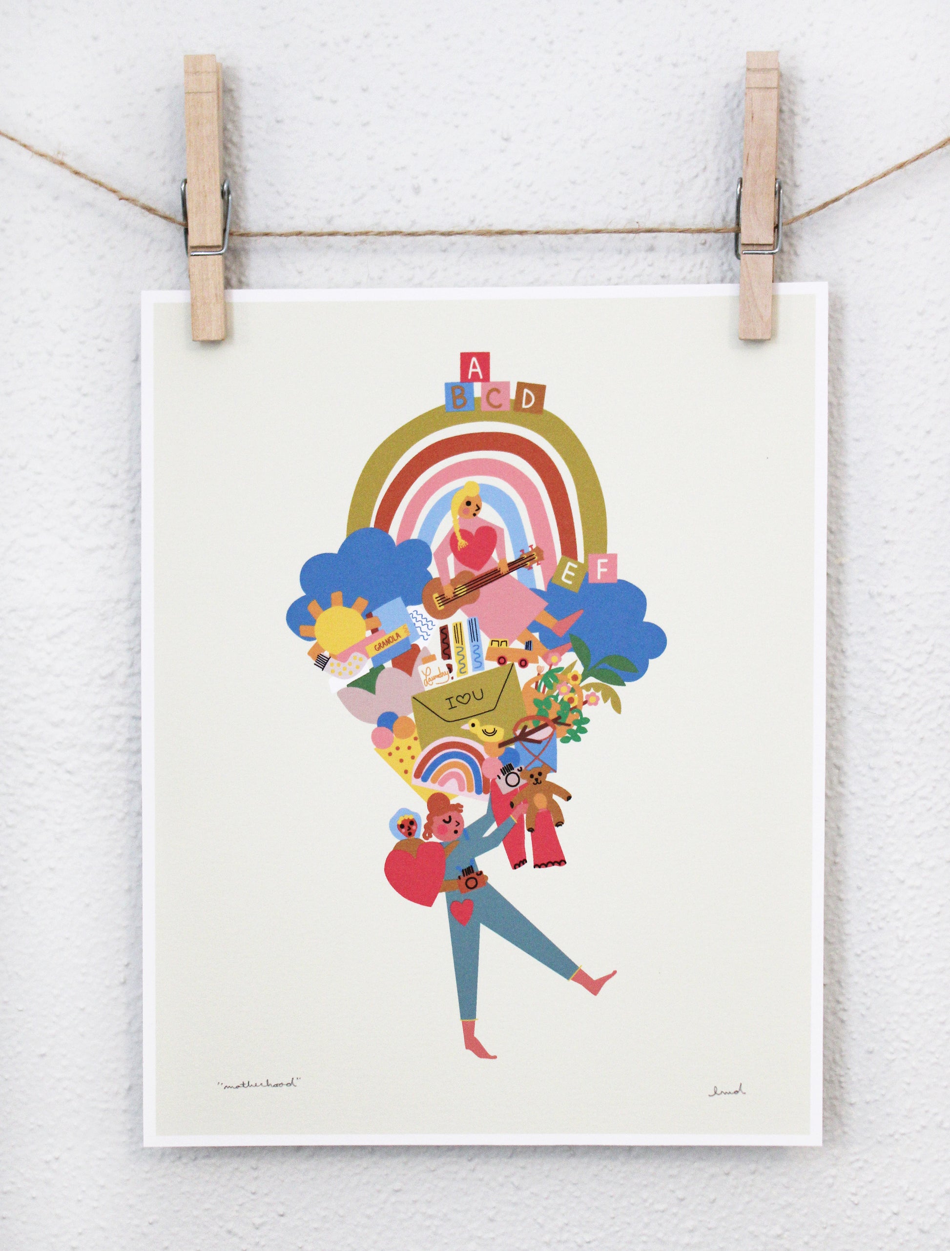 This is an archival print of Leah's "Motherhood" illustration. It has tones of blush, green, coral, yellow, white, beige, ochre, pink, blue, and brown on an off-white background.