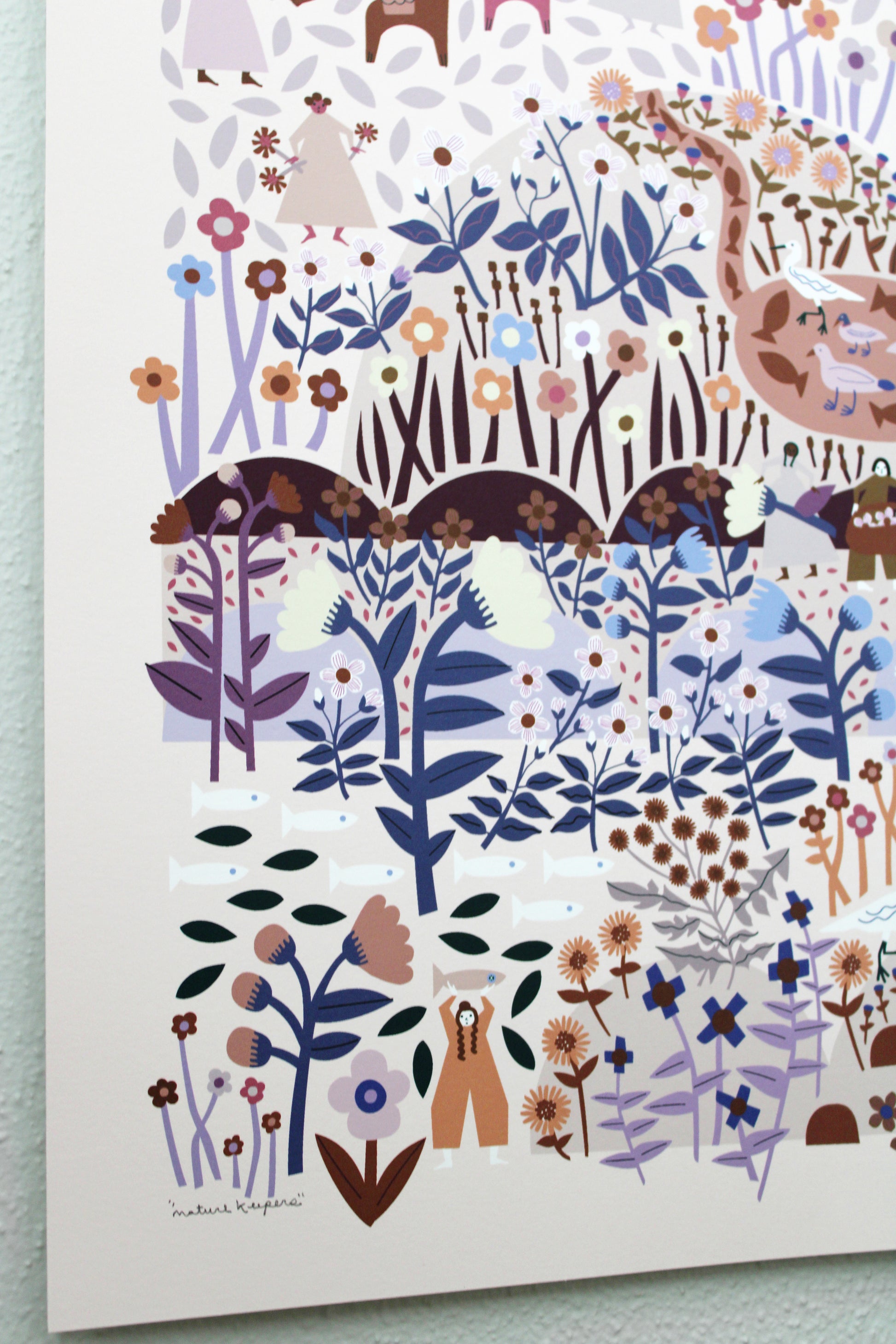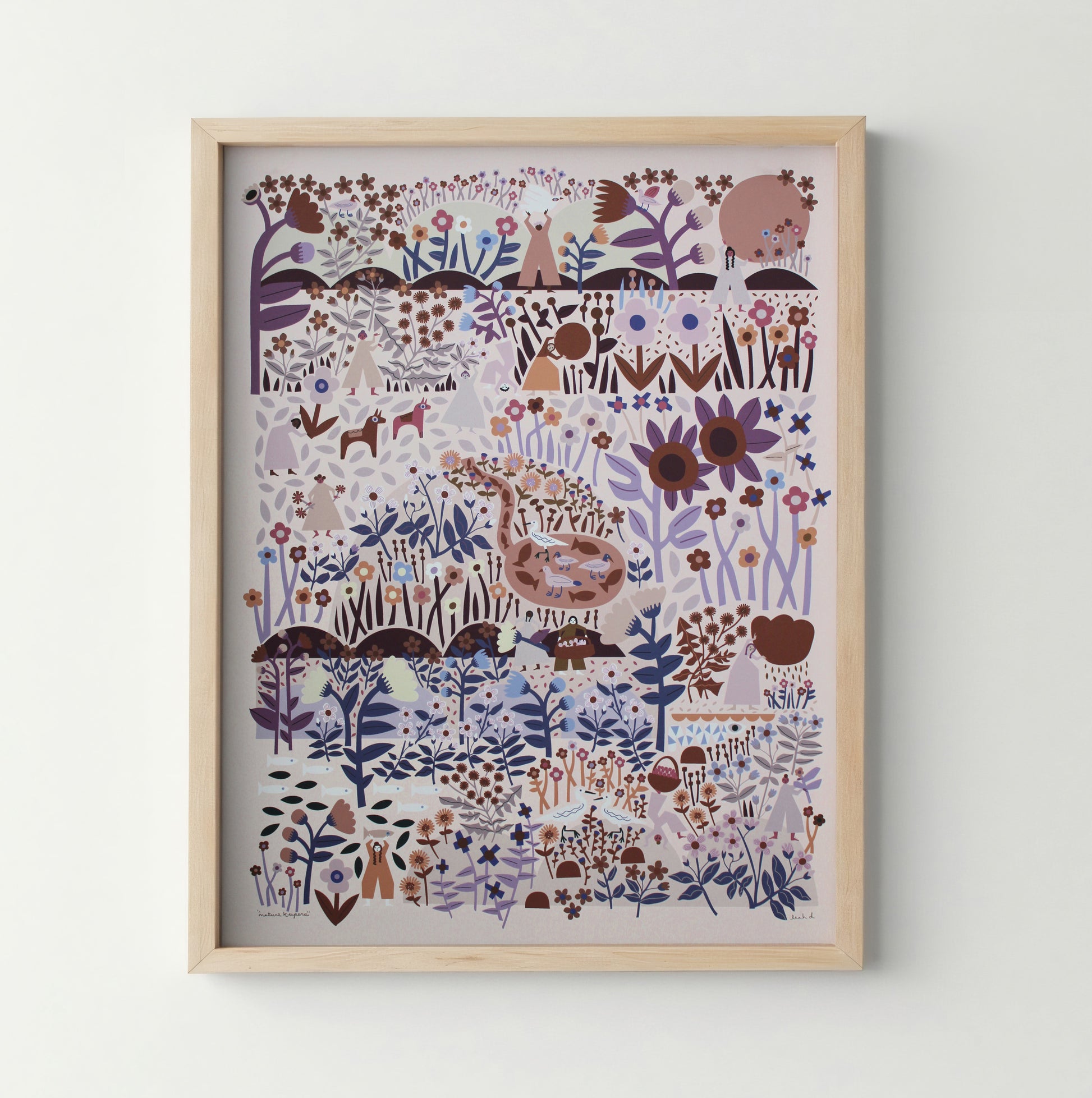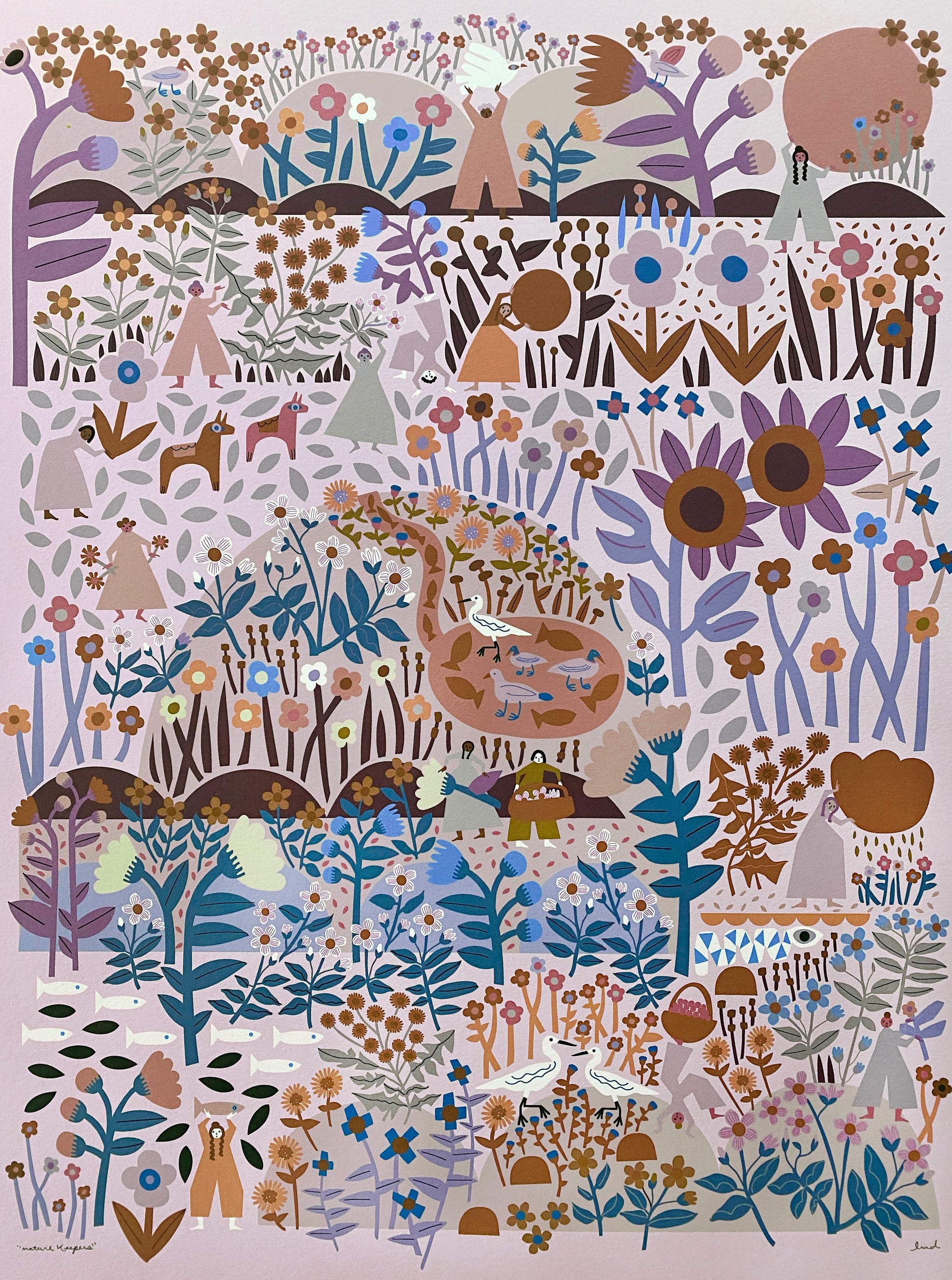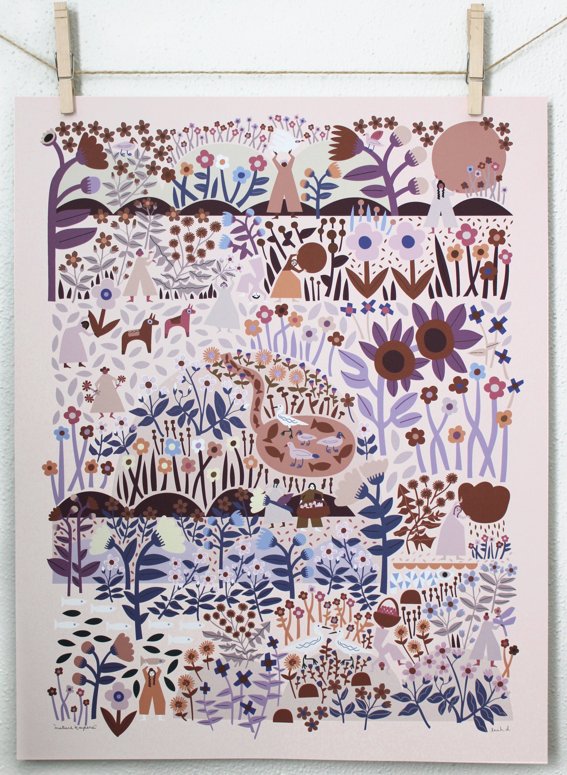 This is an archival print of Leah's "nature keepers" illustration in tones of brown, lavender, coral, purple, dusty orange, and blue on a blush background.