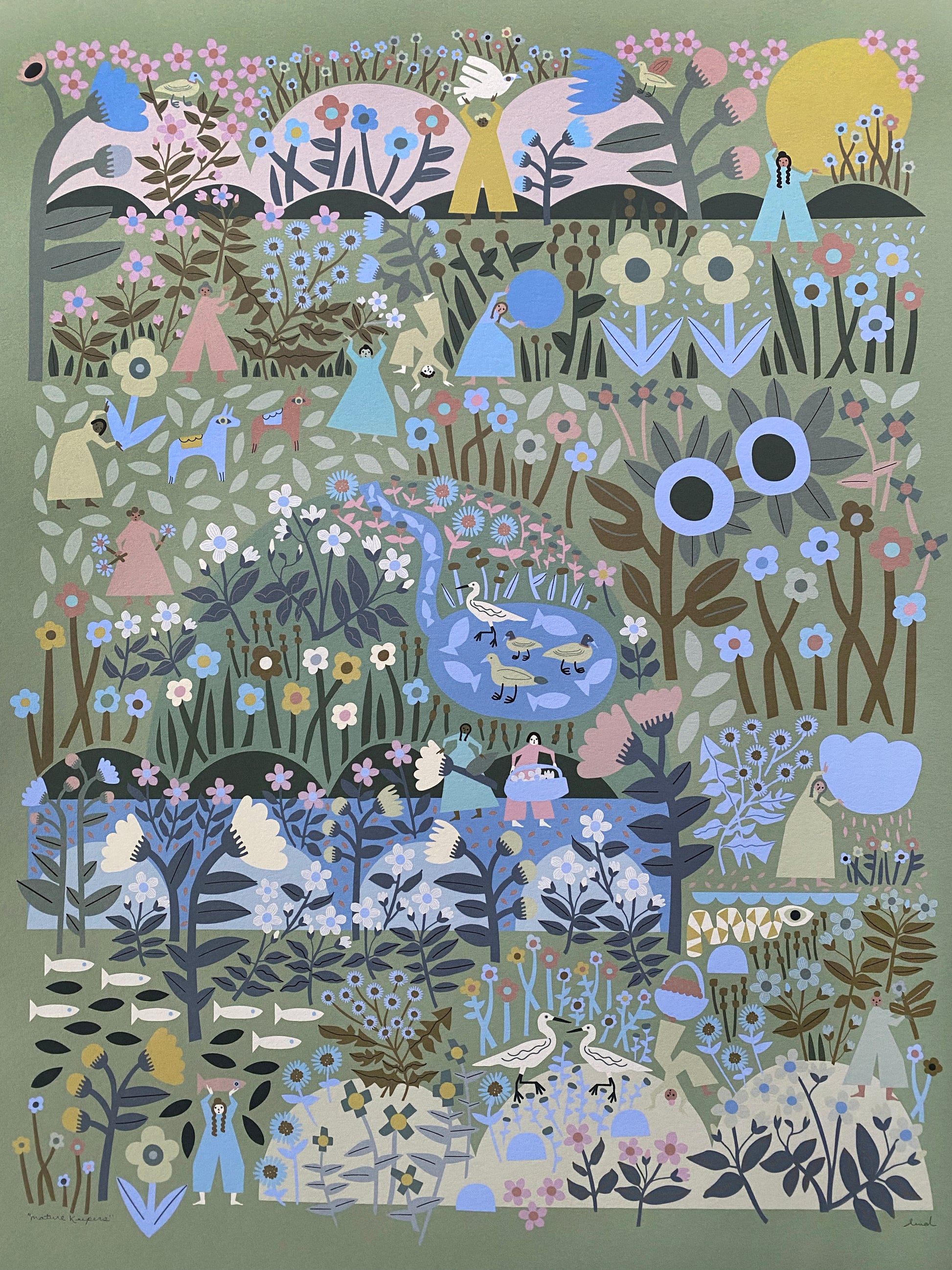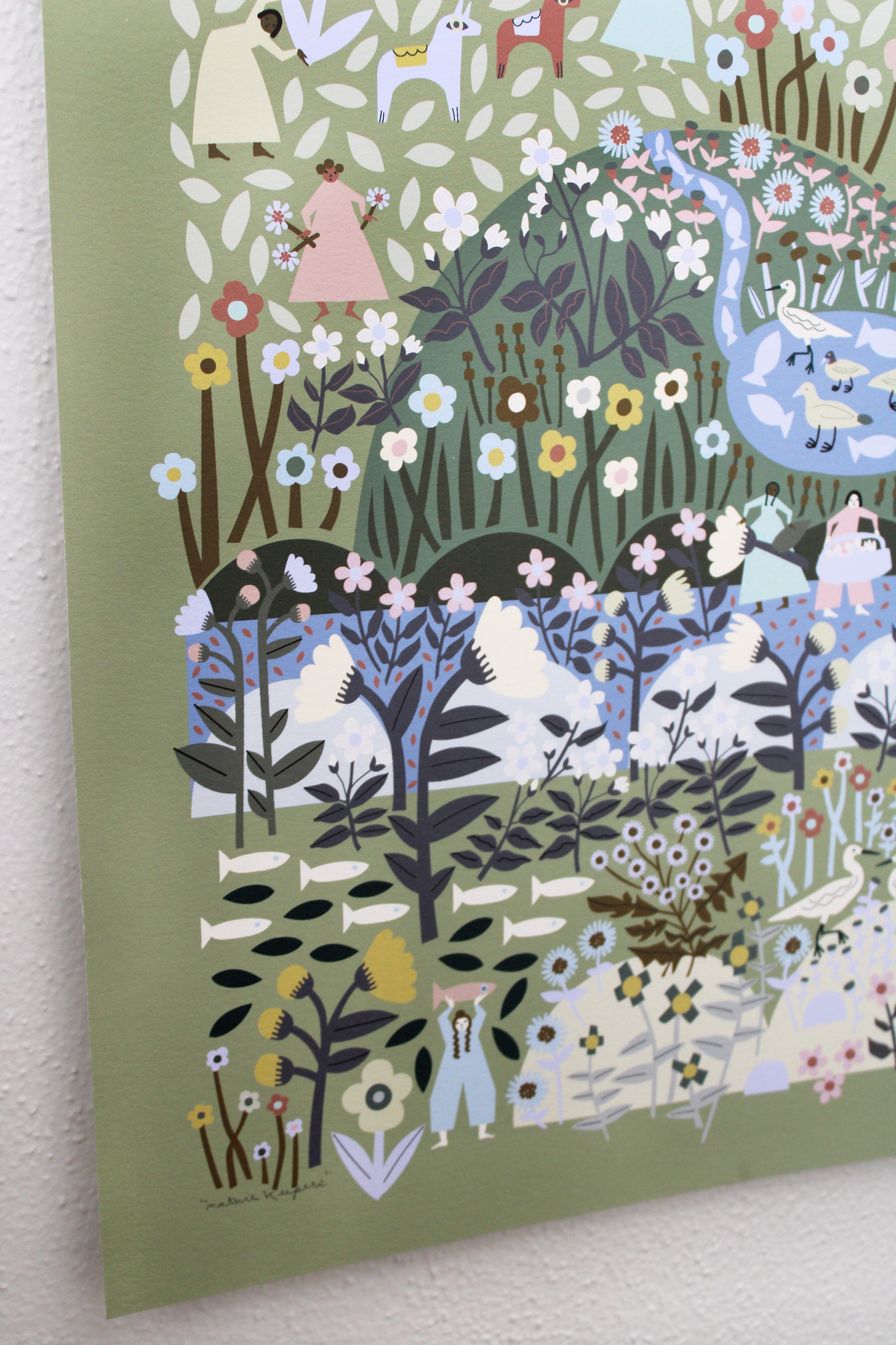 This is an archival print of Leah's "nature keepers" illustration in tones of blue, brown, lime, gray, peach, white, green, and beige on an avocado background.