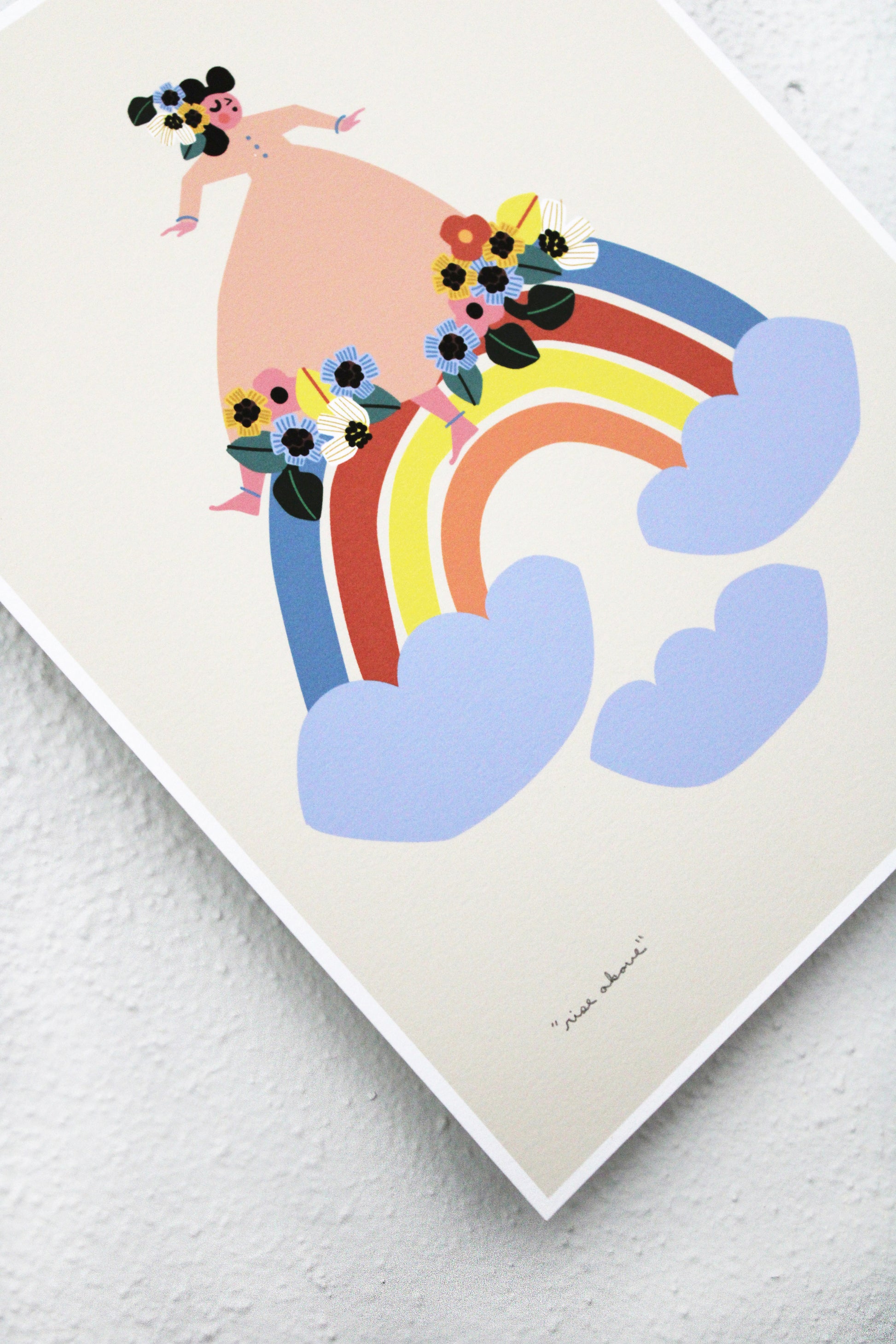 This is an archival print of Leah's "Rise Above" illustration in tones of peach, black, coral, orange, yellow, white, green, and light blue on a light beige background.