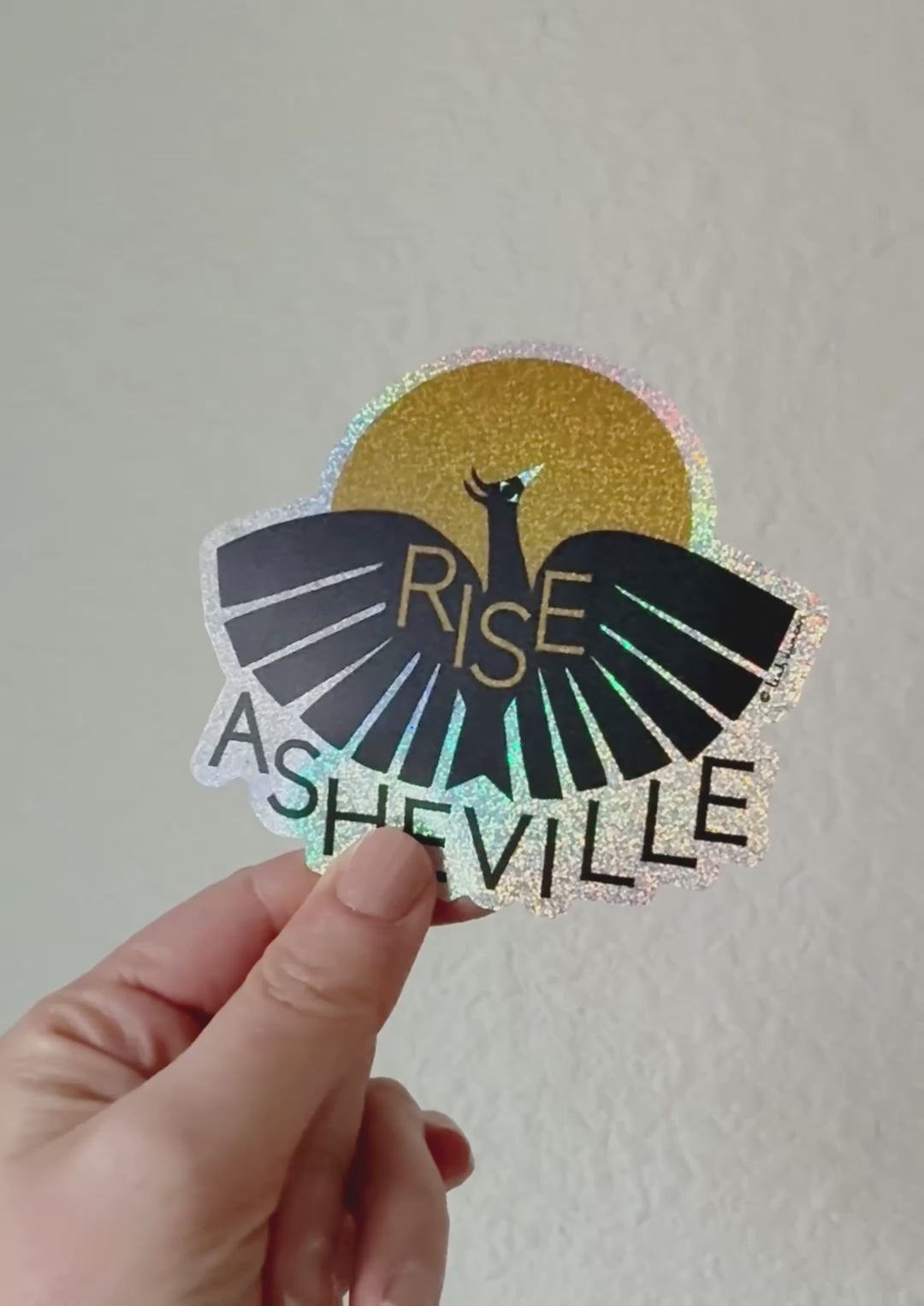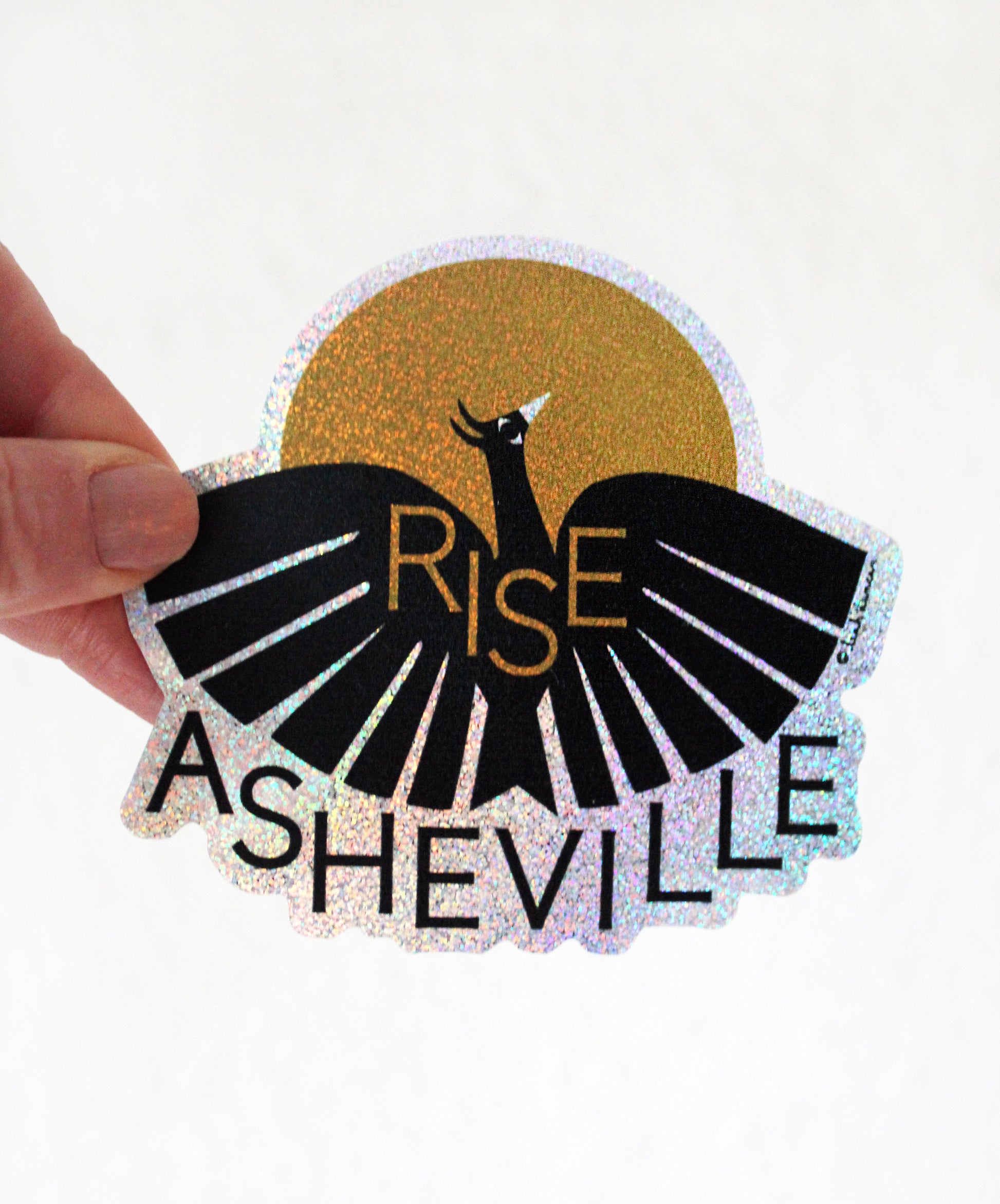 This is a limited edition sticker printed with Leah's Rise Asheville design. Printed with black and gold on a glitter material, for sparkly shimmer. Produced by Lightning Bolt Ink, a living wage certified locally owned Asheville screen printing studio.