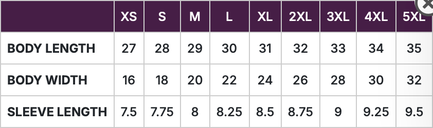 ** See size chart from tee manufacturer in last photo. ** Tee pictured in all photos is size small.