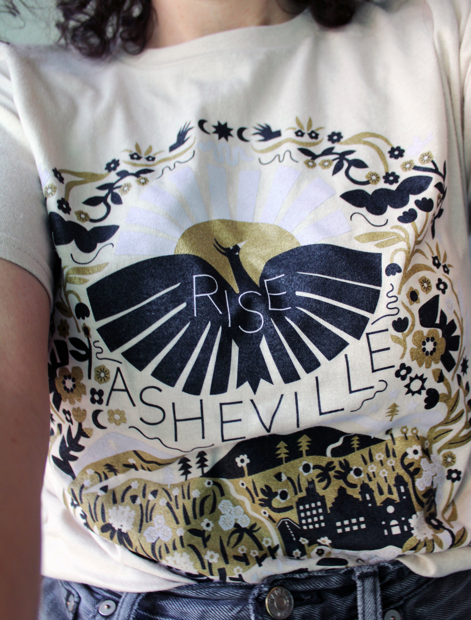 This is a limited edition unisex tee printed with Leah's Rise Asheville design. Printed with black, metallic gold, and a blush lavender. This was printed by Lightning Bolt Ink, a living wage certified locally owned Asheville screen printing studio.