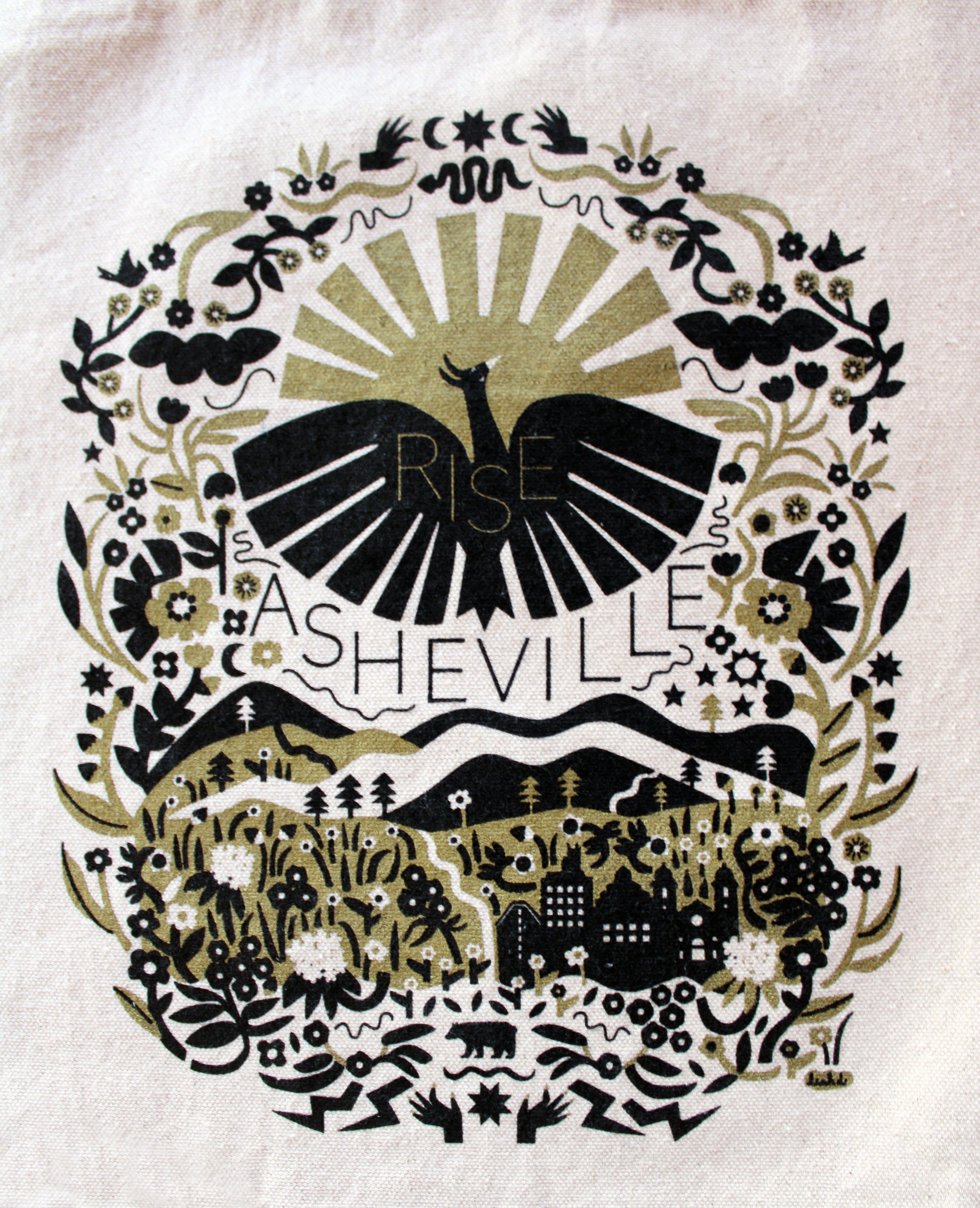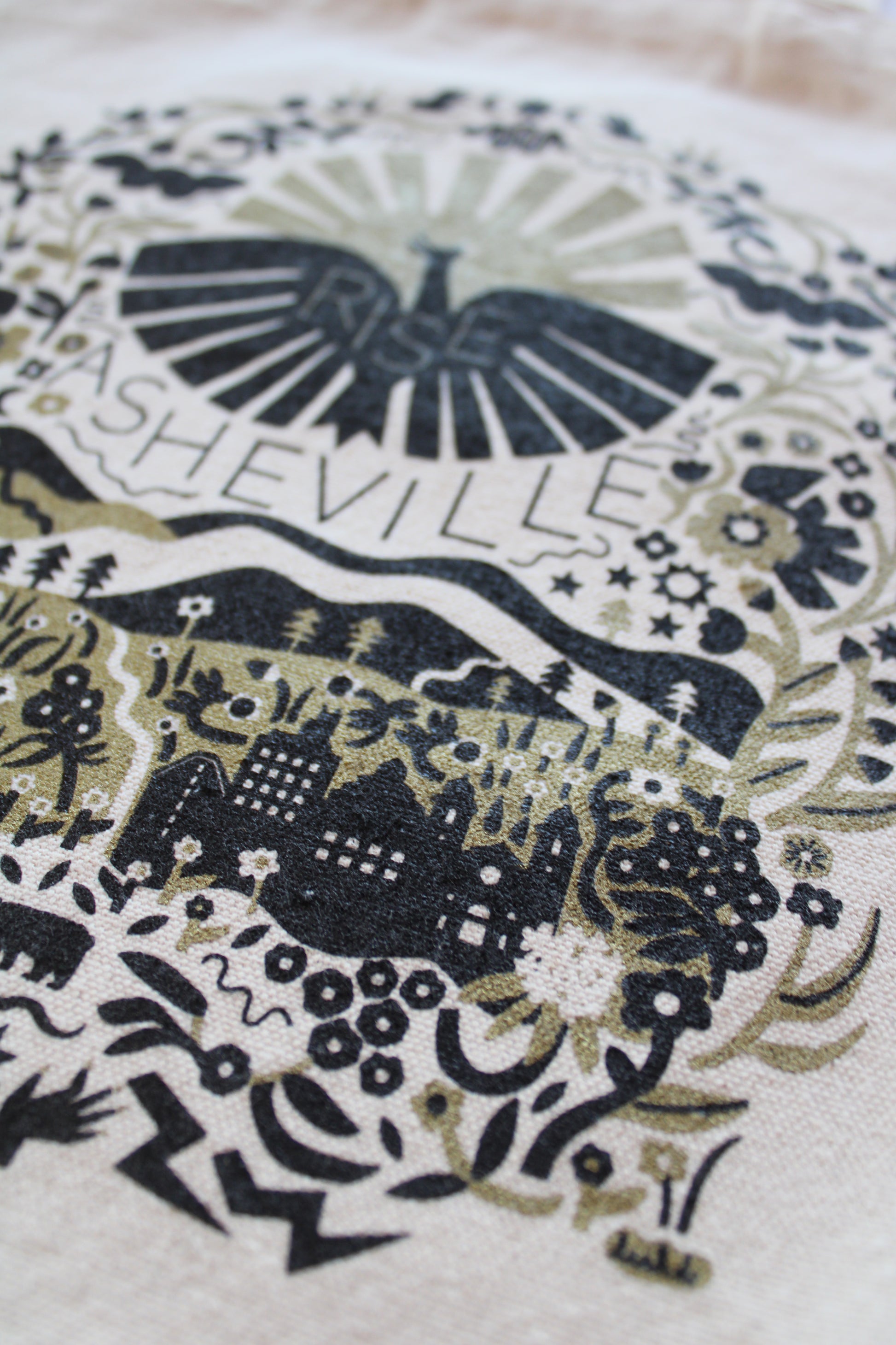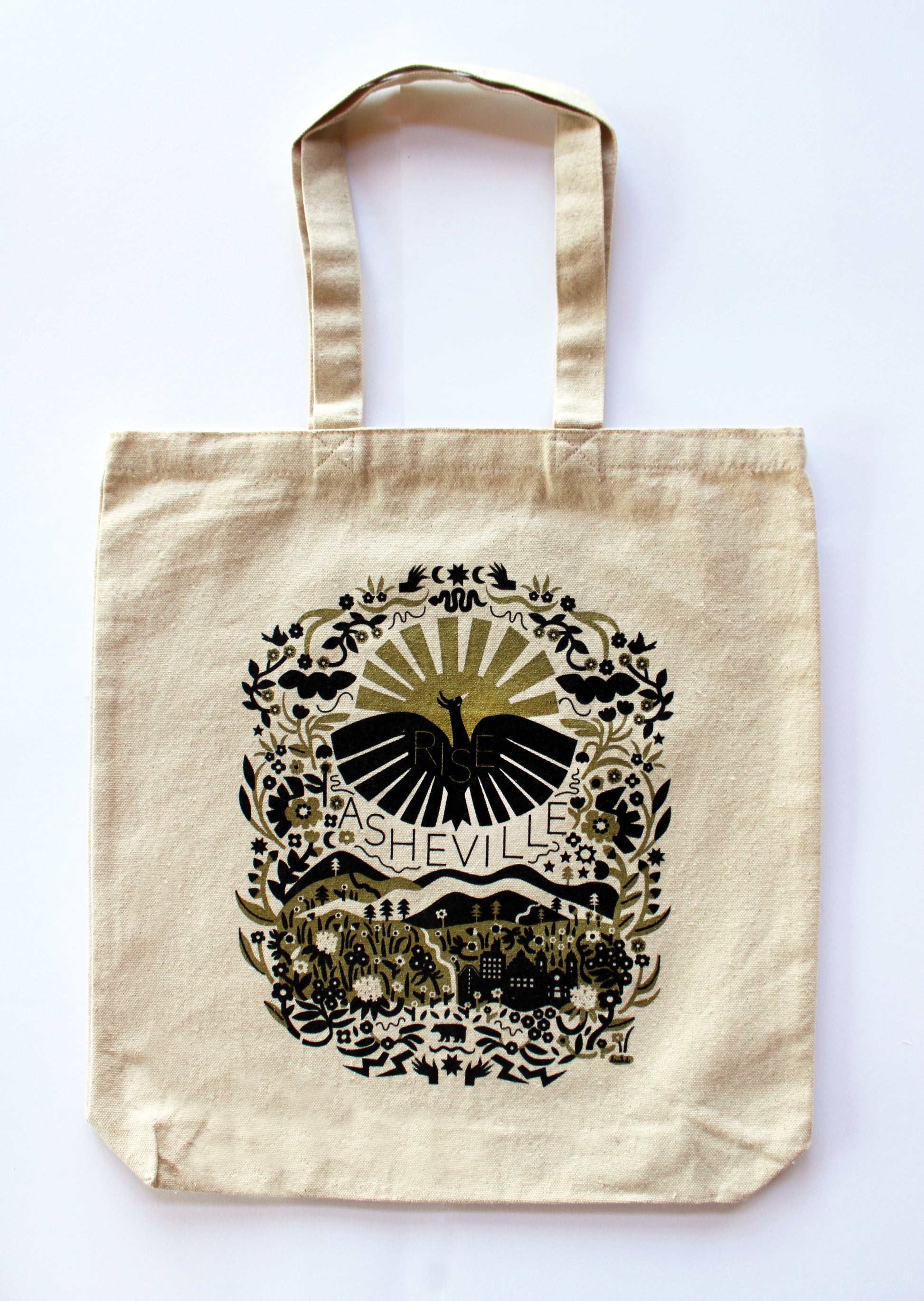 This is a limited edition tote printed with Leah's Rise Asheville design. Printed with black and metallic gold. This tote was printed by Lightning Bolt Ink, a living wage certified locally owned Asheville screen printing studio.