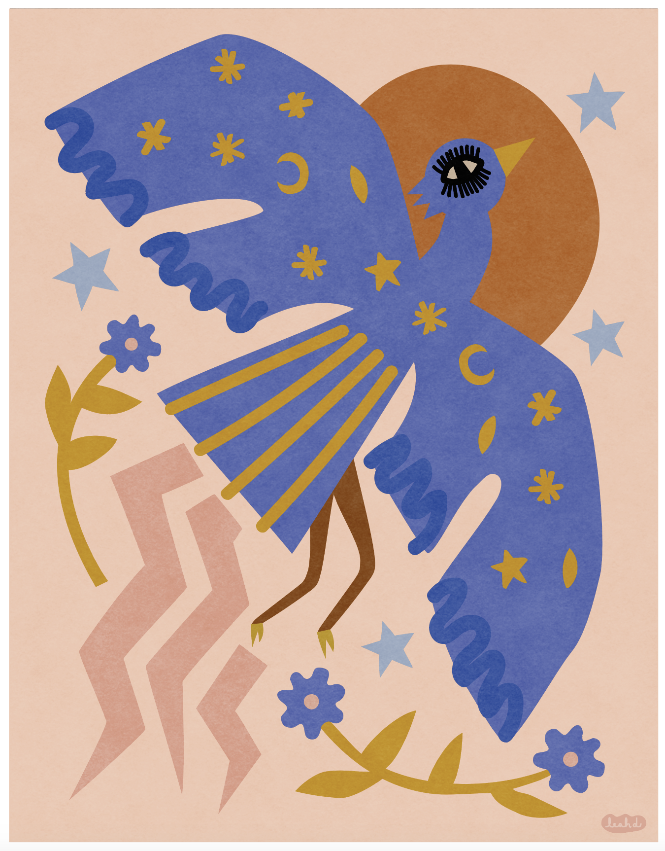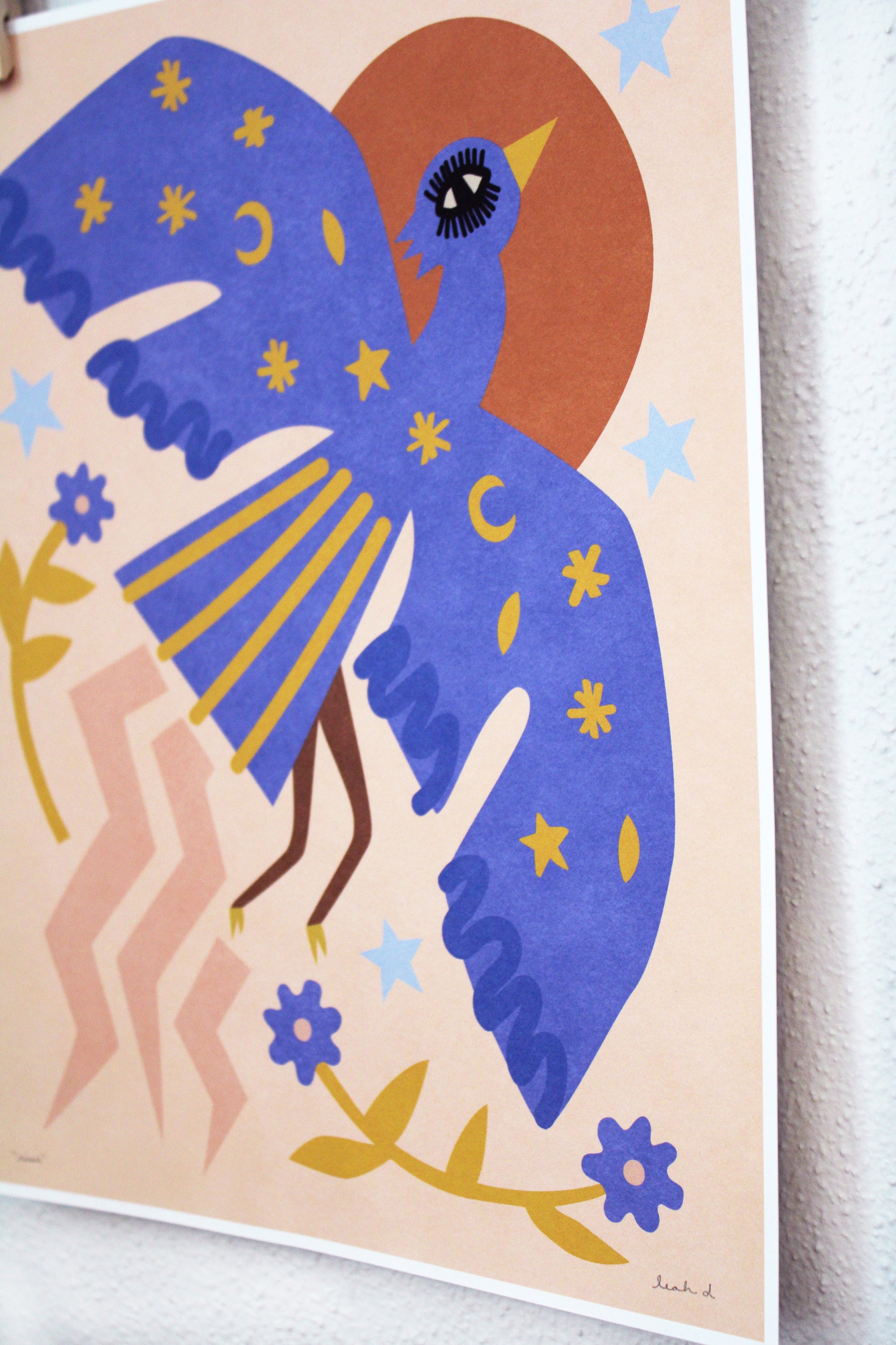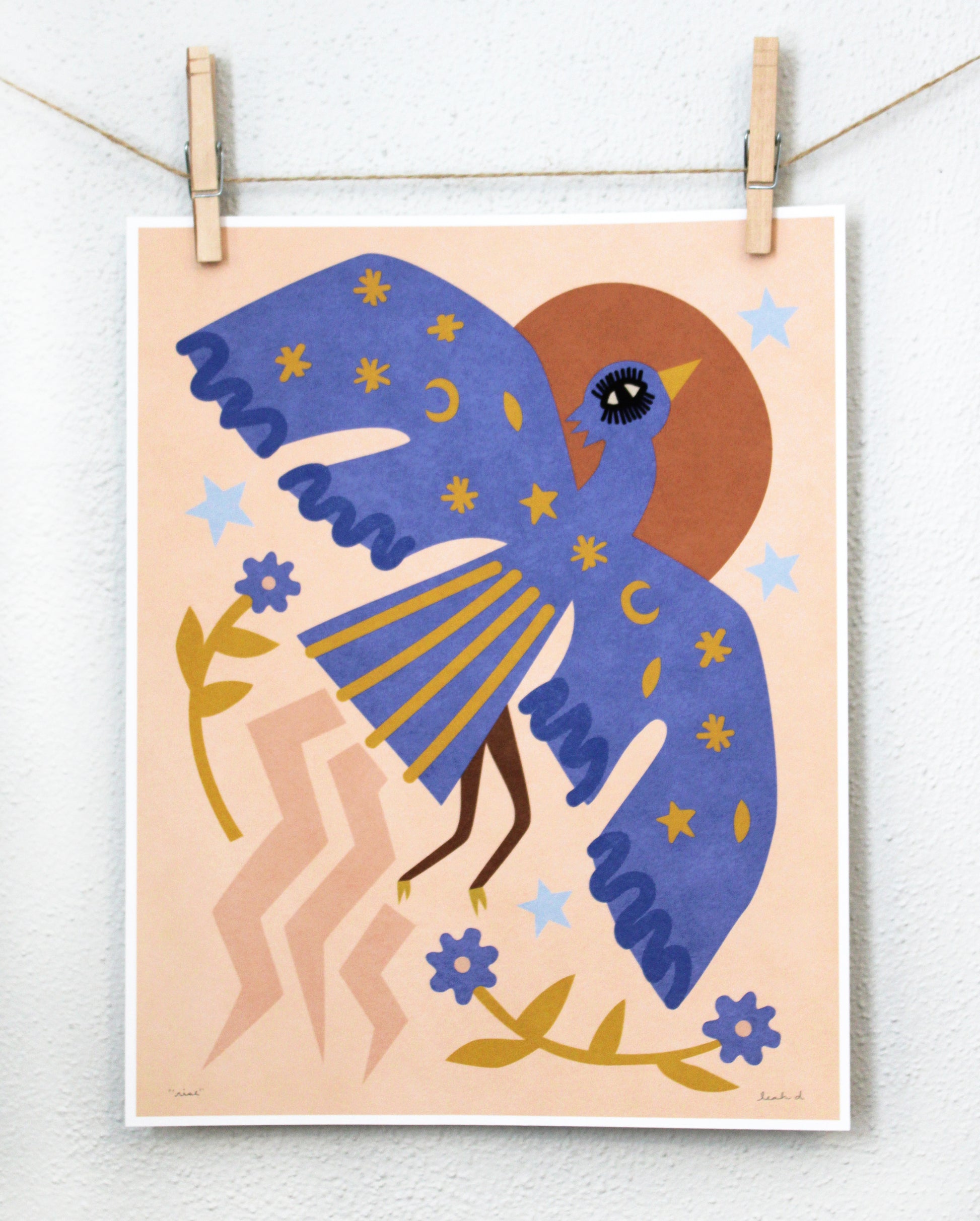 This is an archival print of Leah's "Rise" illustration featuring a phoenix in tones of periwinkle blue, copper brown, golden yellow, pink, and light blue on a peach background.