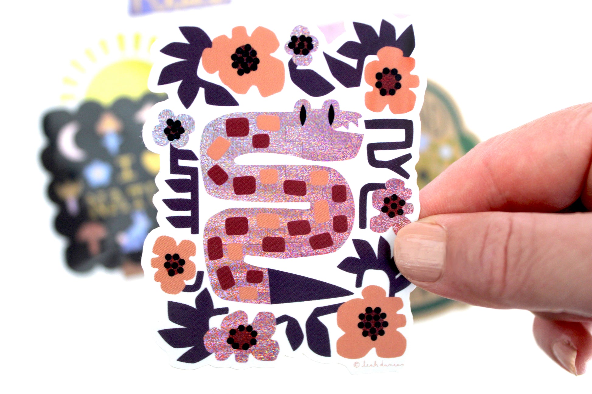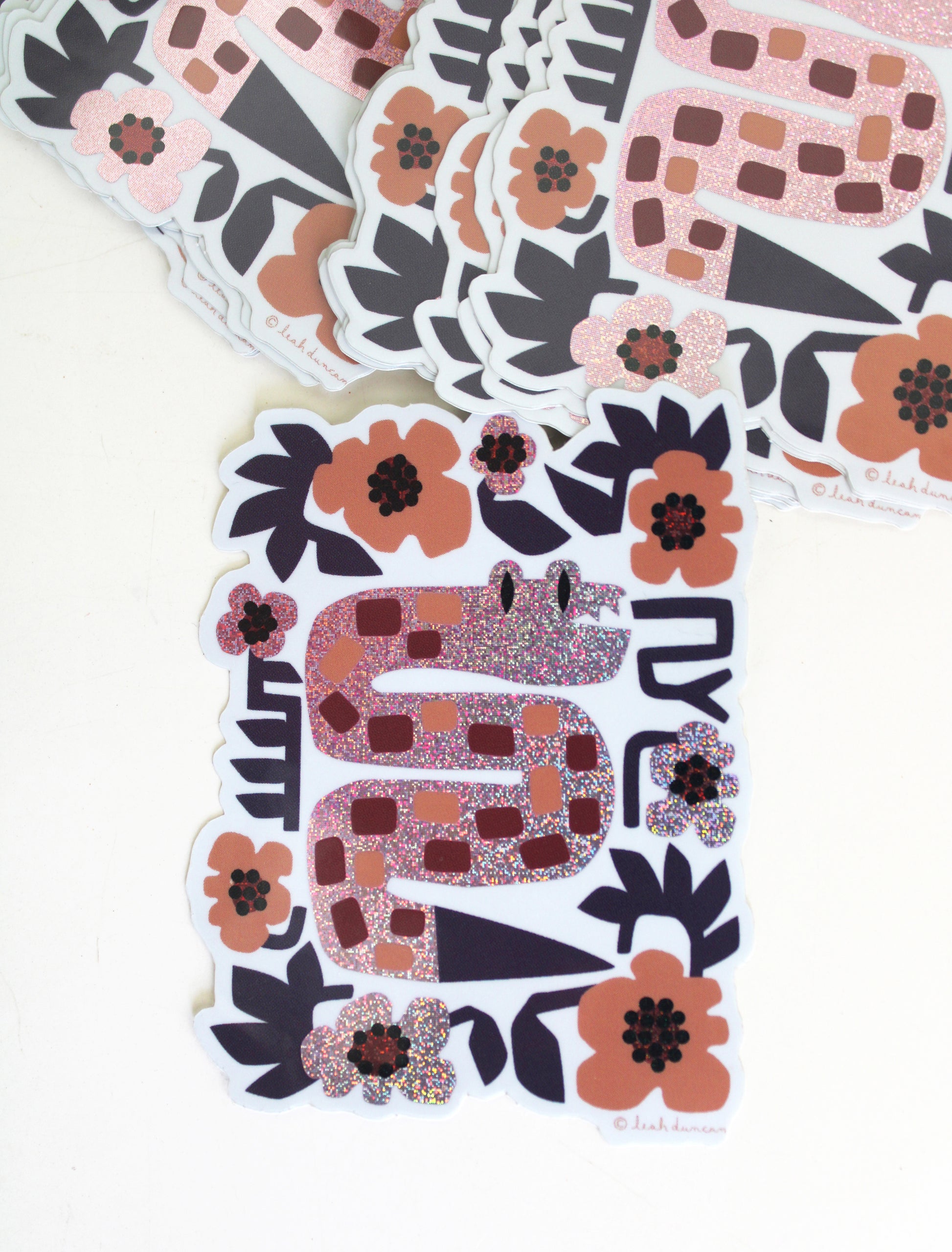 This is a 3" x 2.25" vinyl sticker. This original design by Leah is a glittery snake with flowers in tones of purple, orange, pink, and burgundy. Durable and can be placed on phones, water bottles, computers, etc.