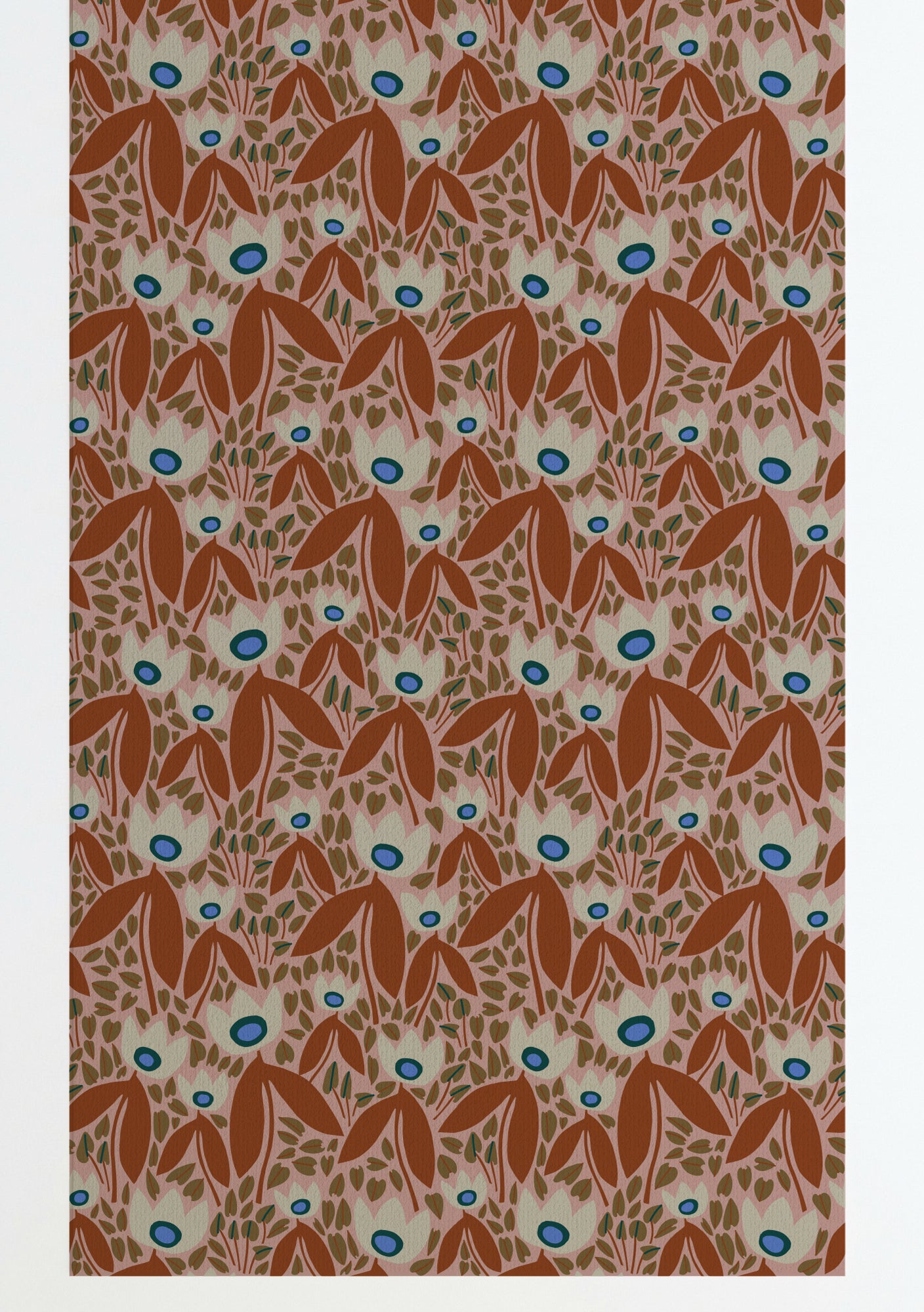 This wallpaper features Leah's two tulips pattern in tones of brown, blue, and off-white on a blush background.