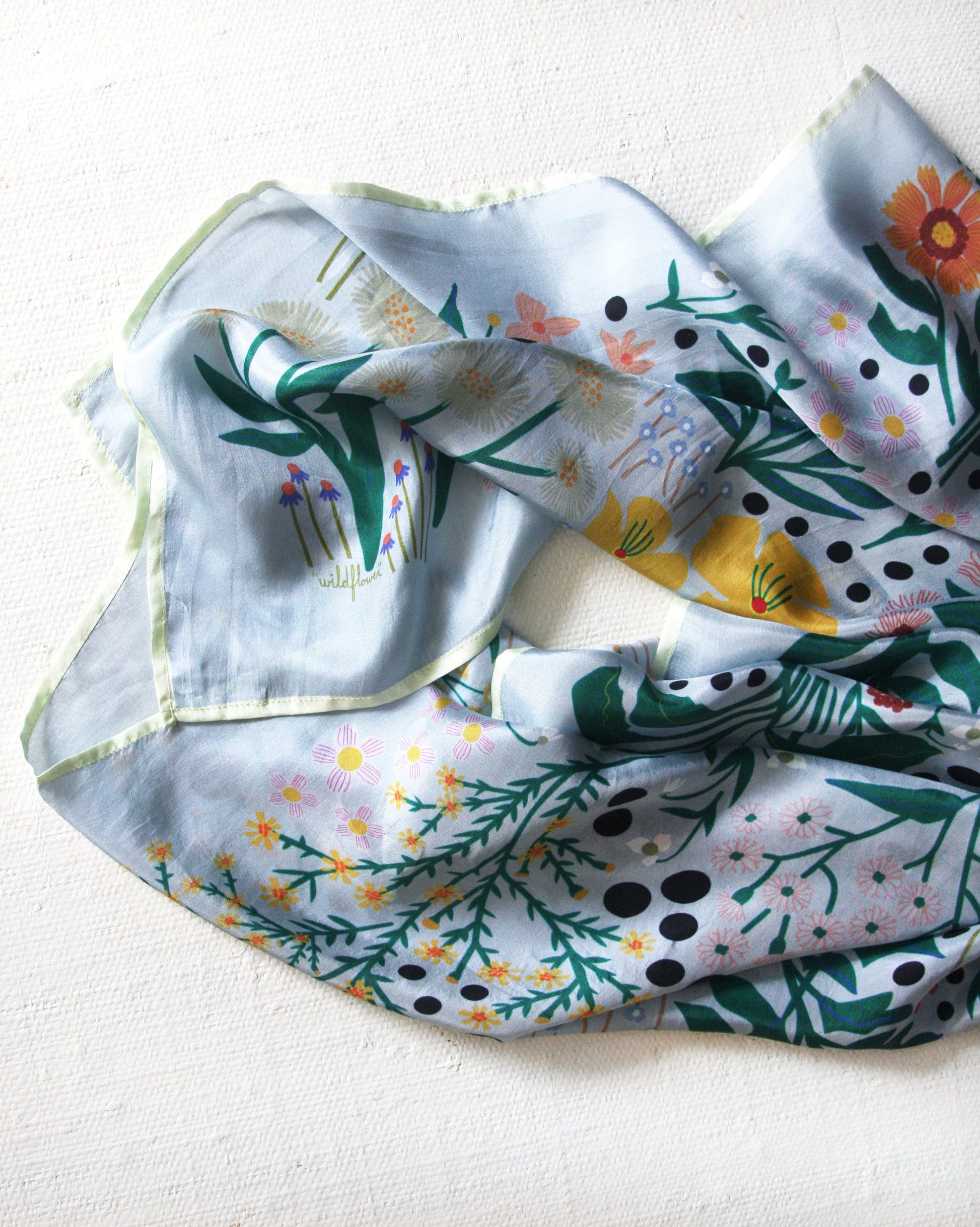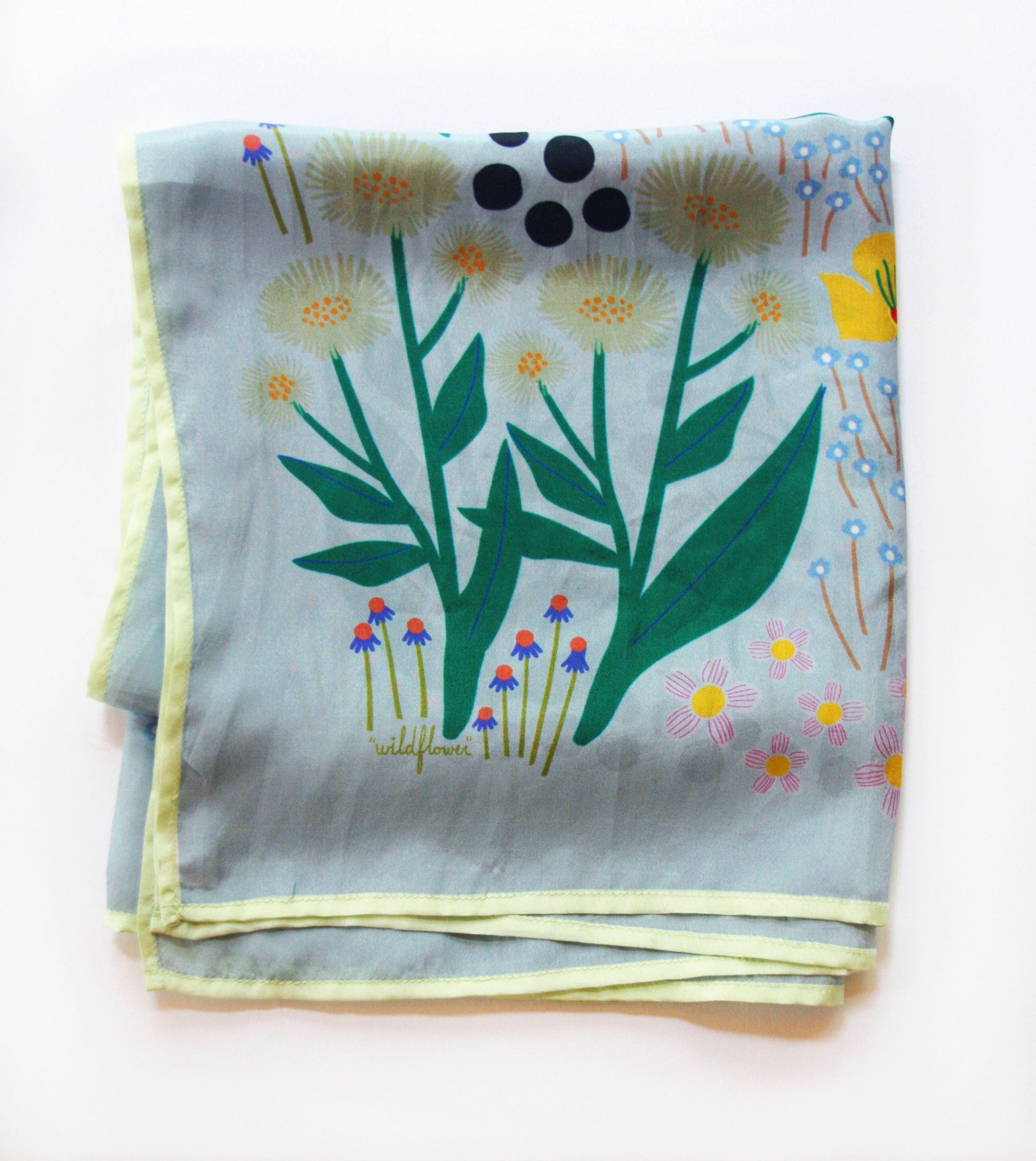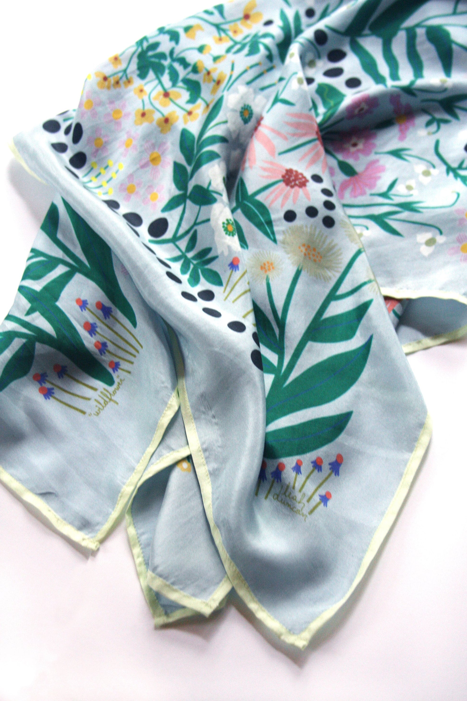 The scarf measures 36" x 36" with a baby hem. Each scarf will be wrapped with tissue paper and shipped carefully in a flat mailer with an info card.