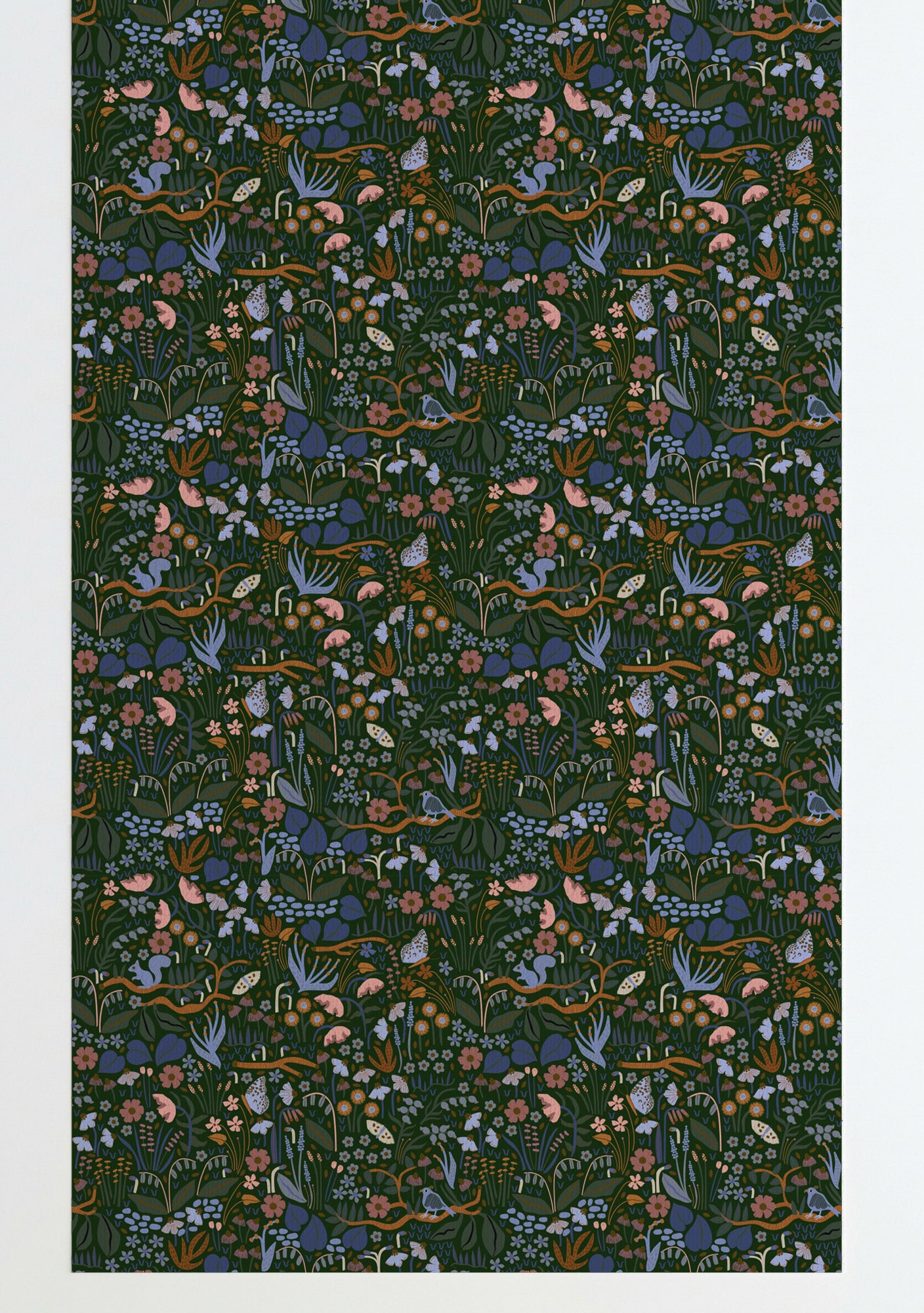 This wallpaper features one of Leah's signature woodland floral patterns in blue, brown, lavender, green, and peach tones on a deep green background.